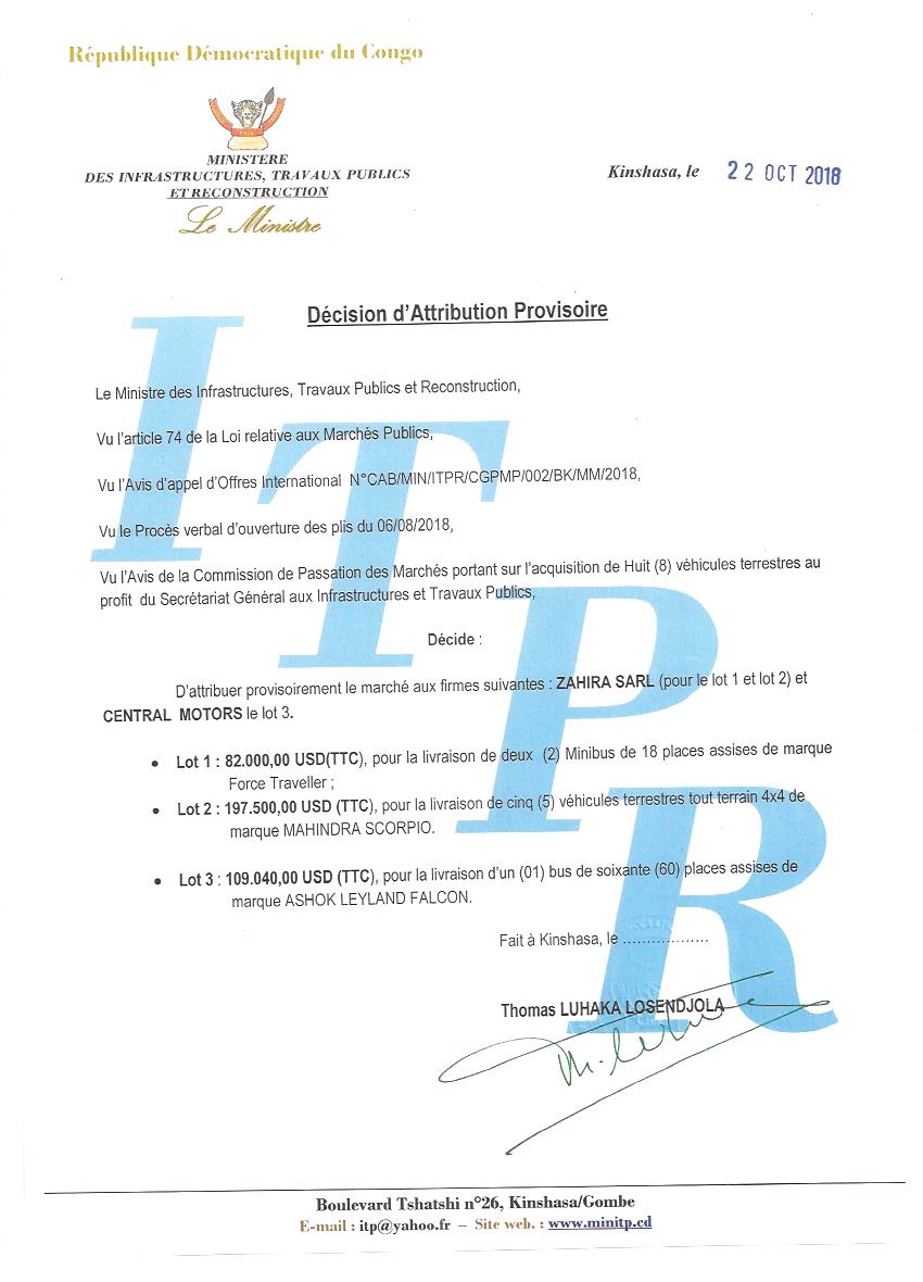 Attribution provisoire accordée aux firmes ZAHIRA SARL et CENTRAL Motors relative au marché d’acquisition de huit (8) véhicules terrestres au profit du secrétariat général aux infrastructures et travaux publics.