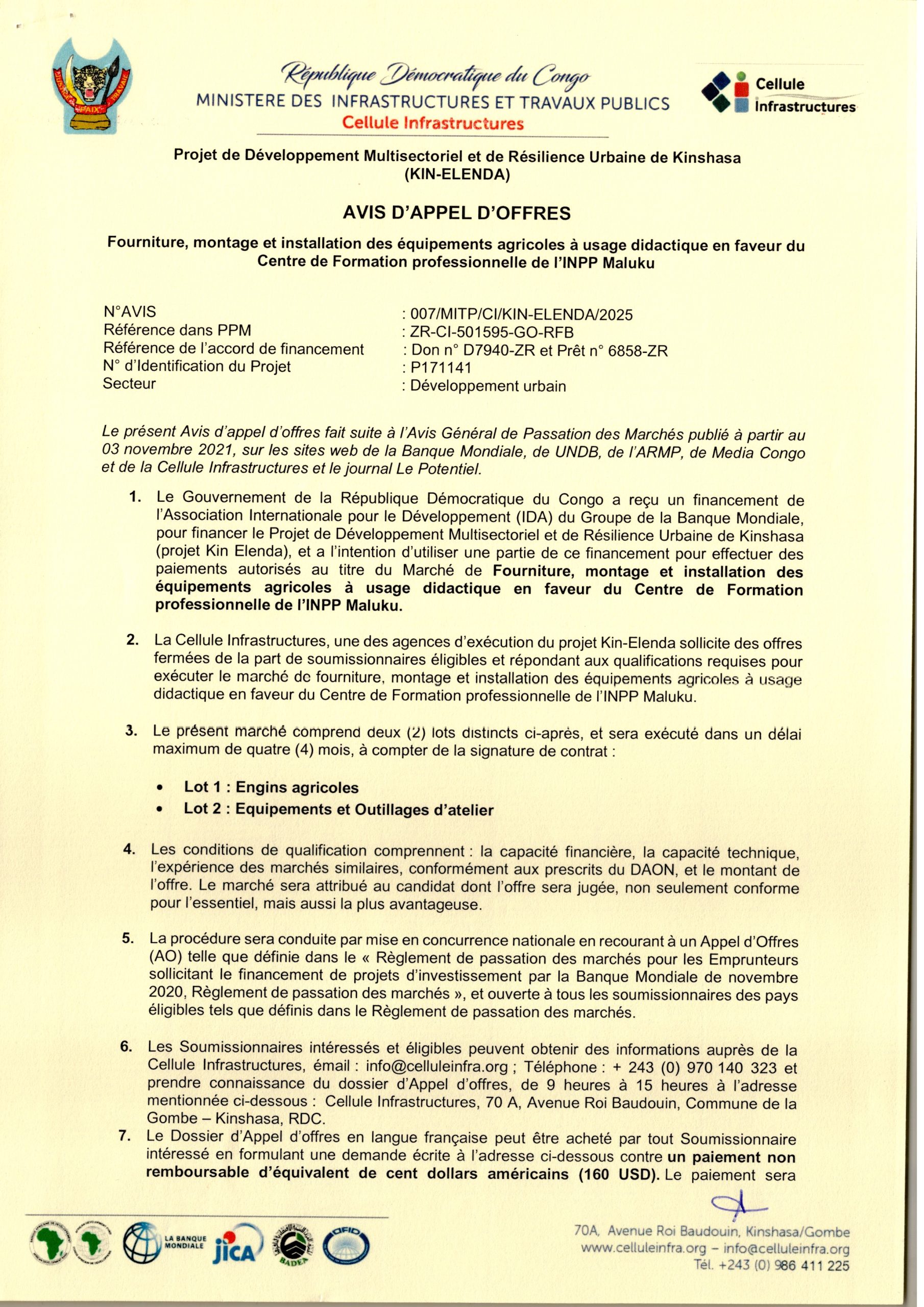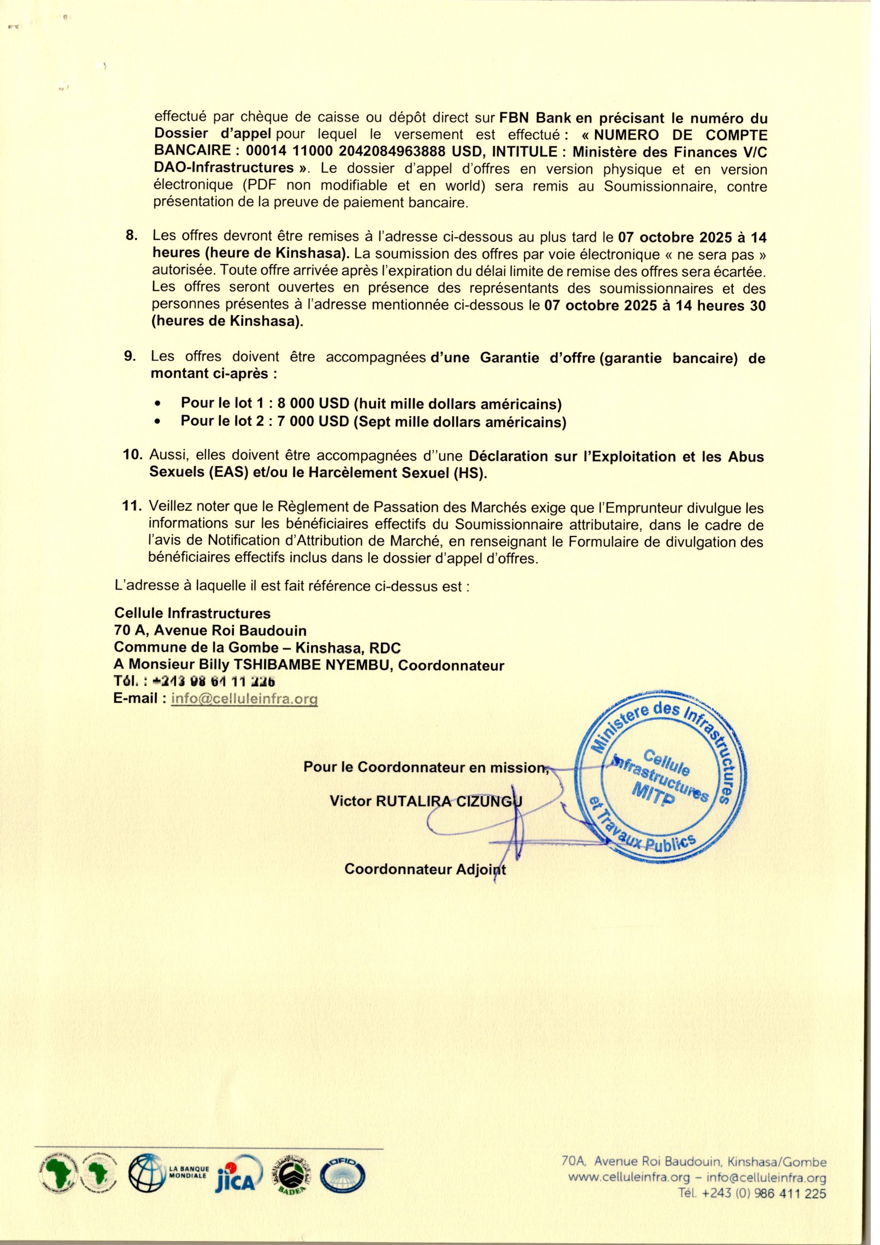 Recrutement d’un consultant (firme) pour mener une campagne de collecter des données topographiques, bathymétriques, géotechniques et d’infrastructures pour la ville de Kalemie dans la Province du Tanganika.