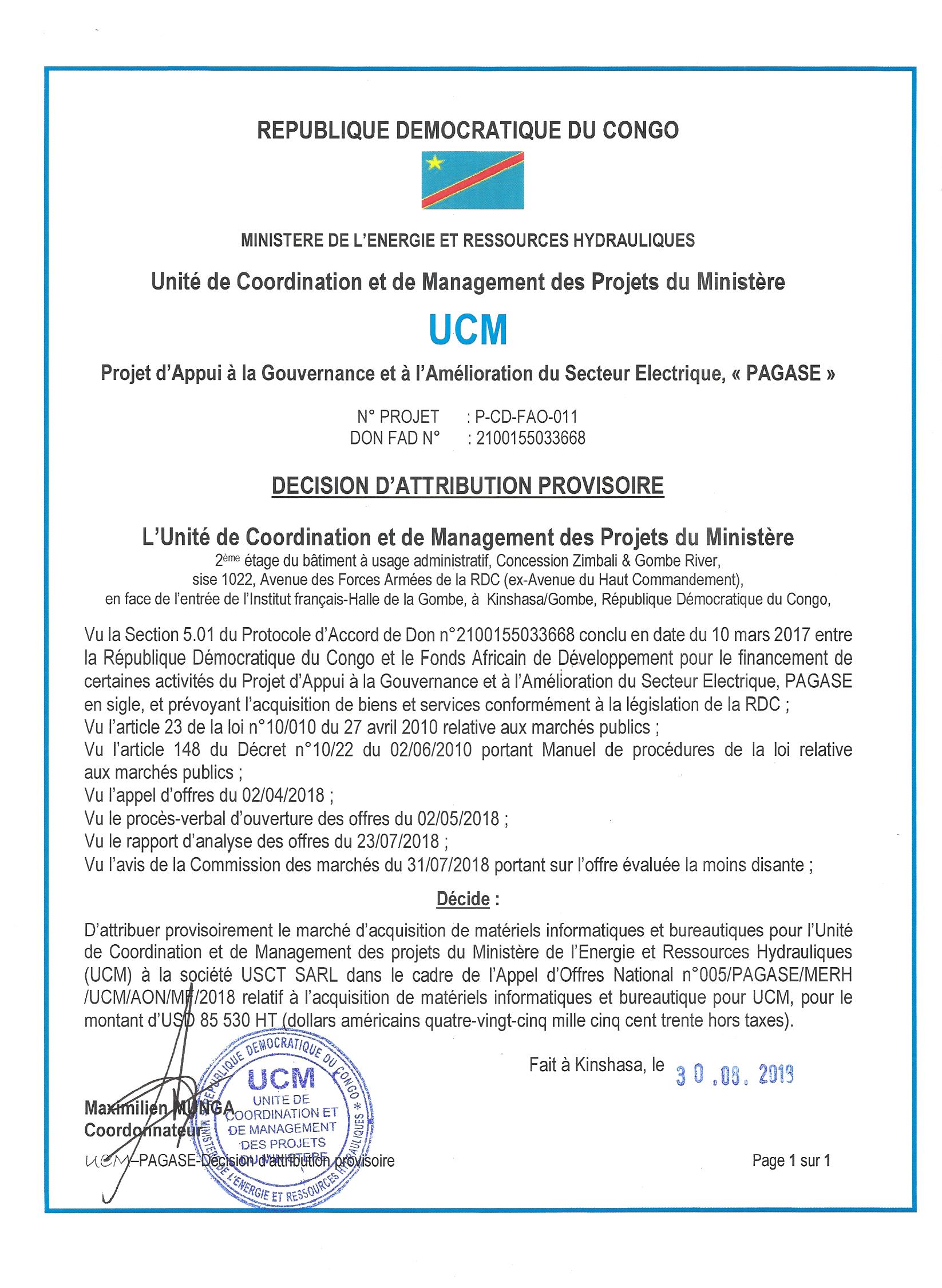 Attribution provisoire du marché relatif d’acquisition de matériels informatiques et bureautiques pour l’unité de coordination et de management des projets du ministère de l’énergie et ressources hydrauliques à la société USCT SARL.