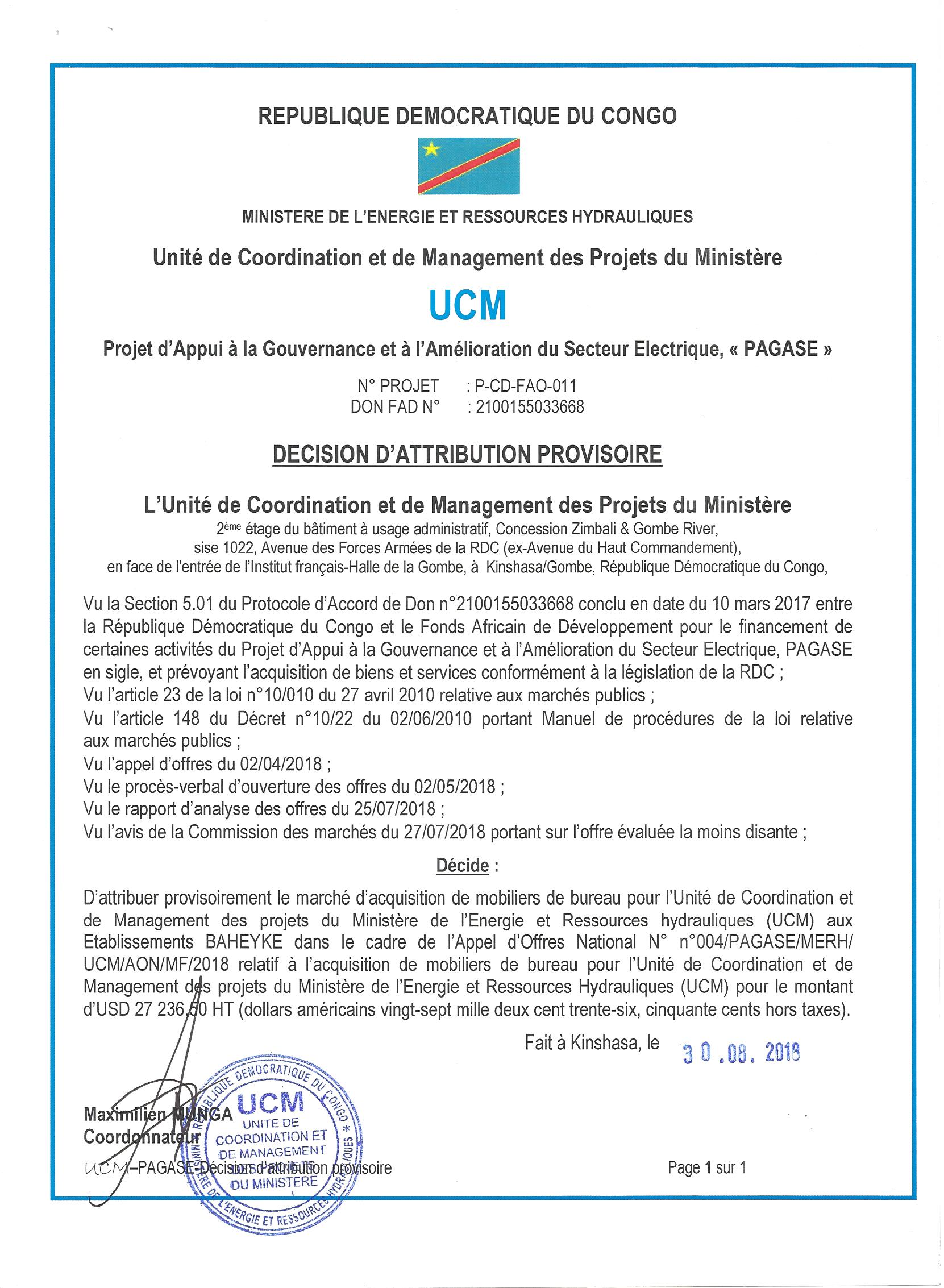 Attribution provisoire du marché relatif d’acquisition de mobiliers de bureau pour l’unité de coordination et de management des projets du ministère de l’énergie et ressources hydrauliques aux établissements BAHEYKE.