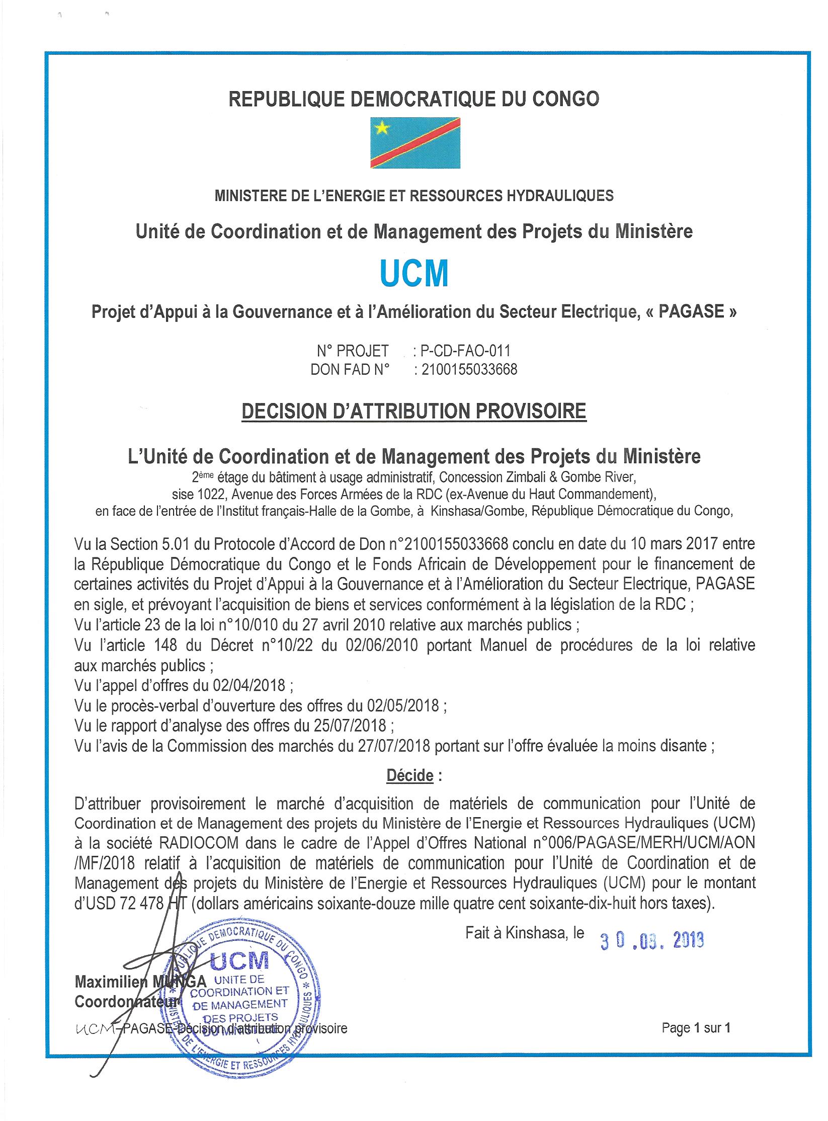 Attribution provisoire du marché relatif d’acquisition de matériels de communication pour l’unité de coordination et de management des projets du ministère de l’énergie et ressources hydrauliques à la société RADIOCOM.