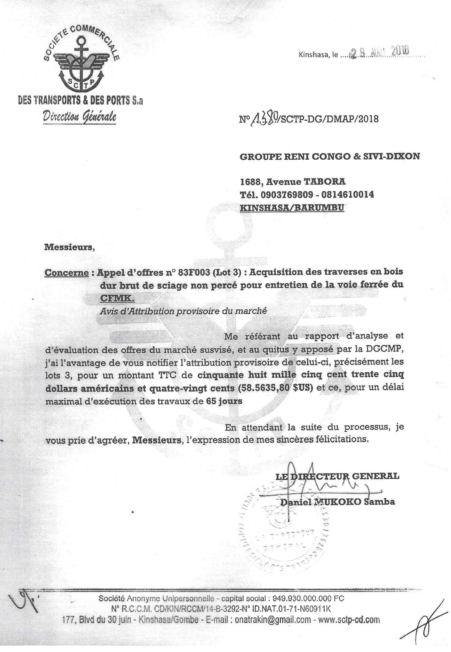 Attribution provisoire du marché relatif à l’acquisition des traverses en bois dur brut de sciage non percé pour entretien de la voie ferrée du cfmk à la société GROUPE RENI CONGO & SIVI-DIXON.