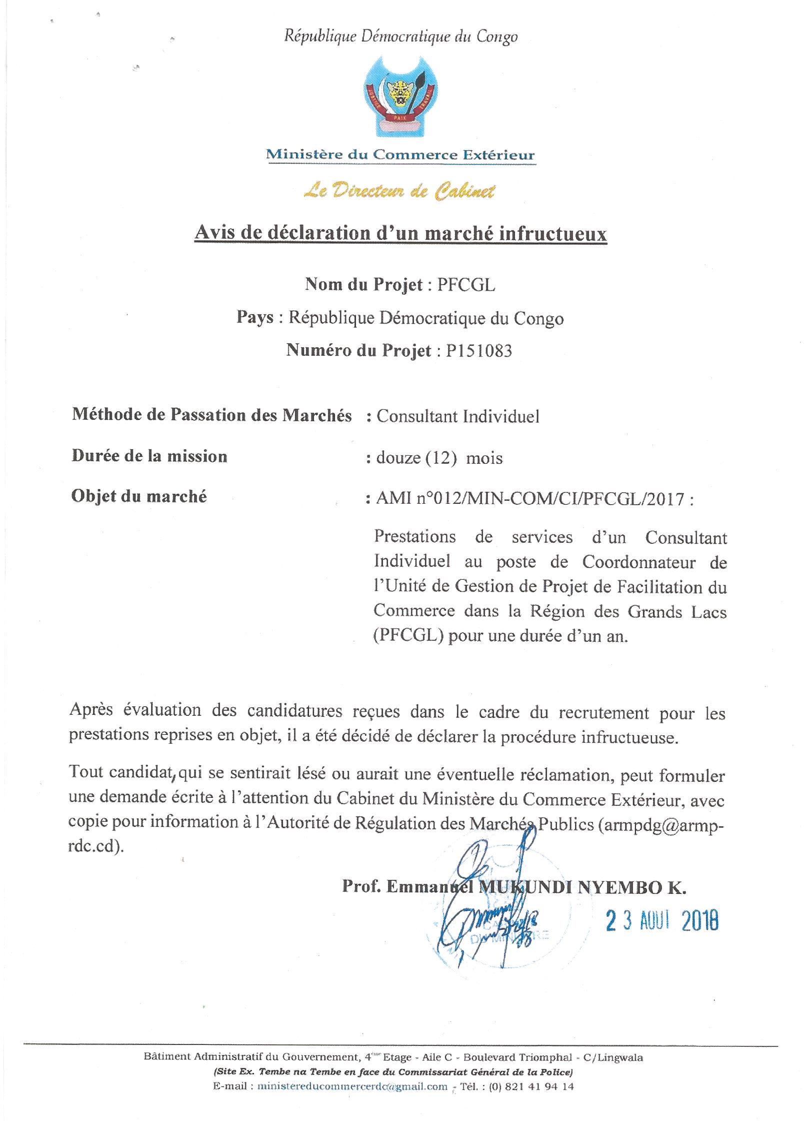 Avis de déclaration d’un marché infructueux Relatif à l’AMI n°012/MIN-COM/CI/PFCGL/2017.