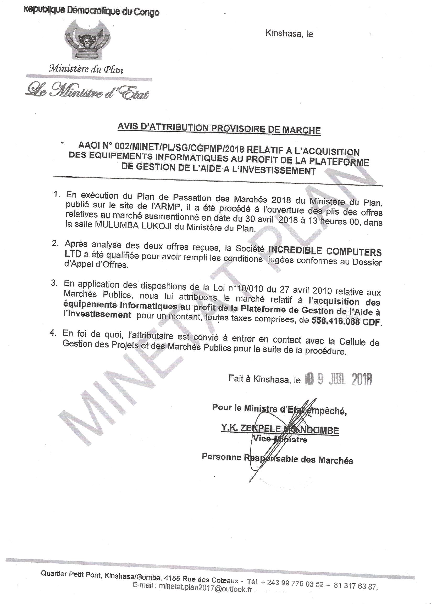 Attribution provisoire de marché relatif à l’acquisition des équipements informatiques au profit de la plateforme de gestion de l’aide à l’investissement à la société INCREDIBLE COMPUTERS Ltd.