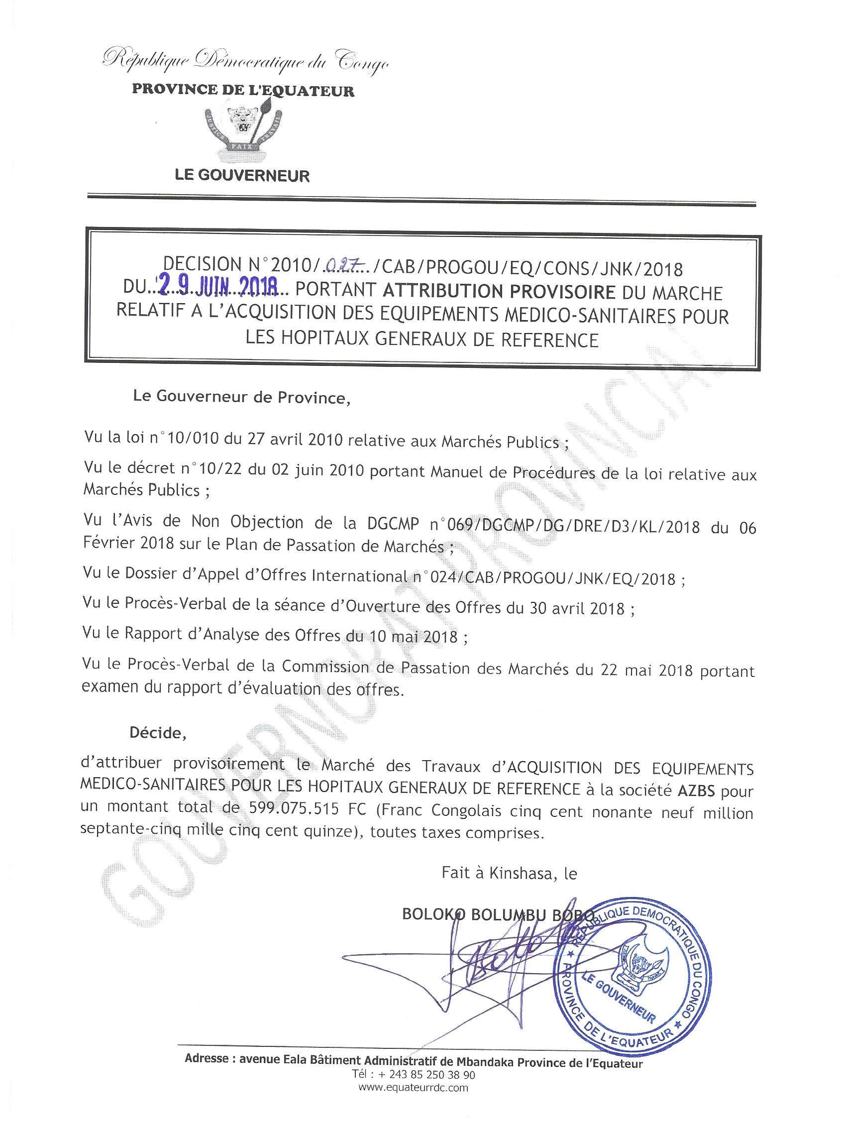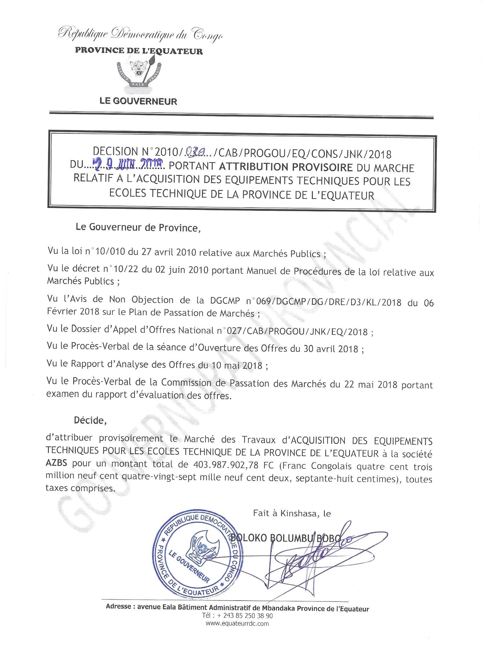 Attribution provisoire du marché relatif à l’acquisition des équipements techniques pour les écoles technique de la province de l’équateur à la société AZBS.