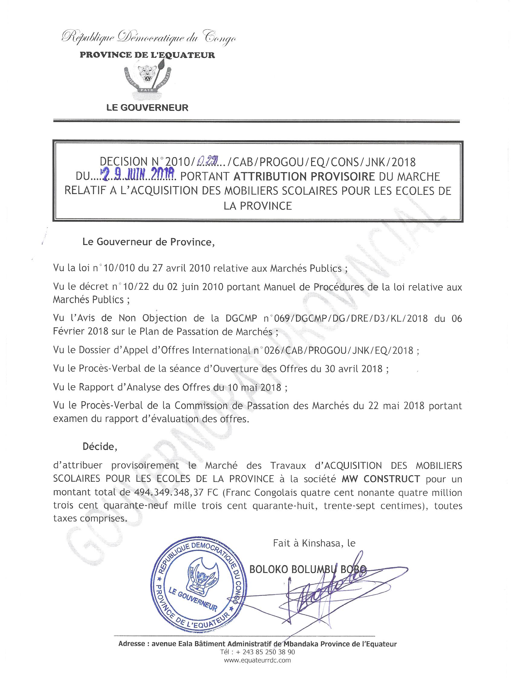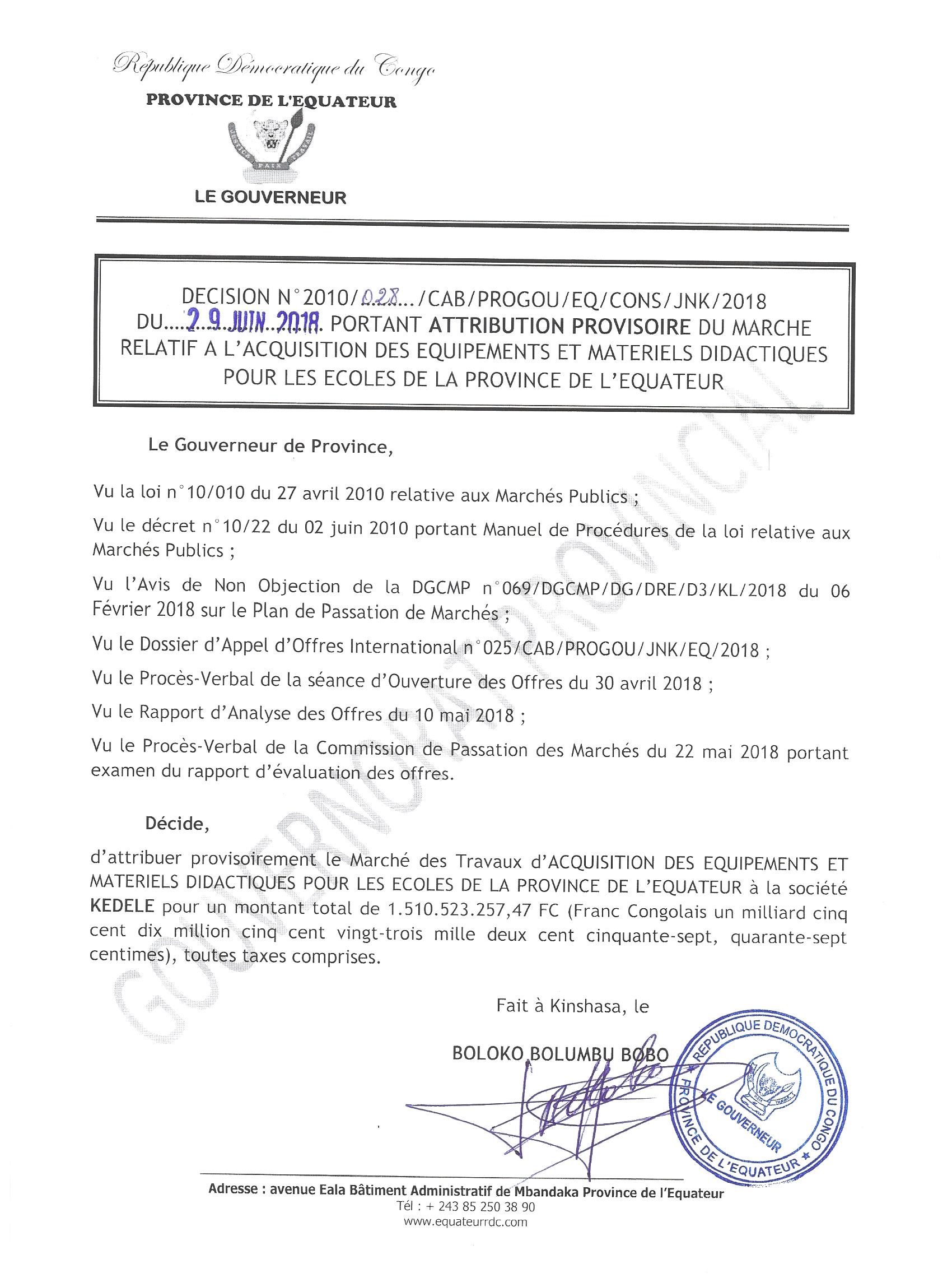 Attribution provisoire du marché relatif à l’acquisition des équipements et matériels didactiques pour les écoles de la province de l’équateur à société KEDELE.