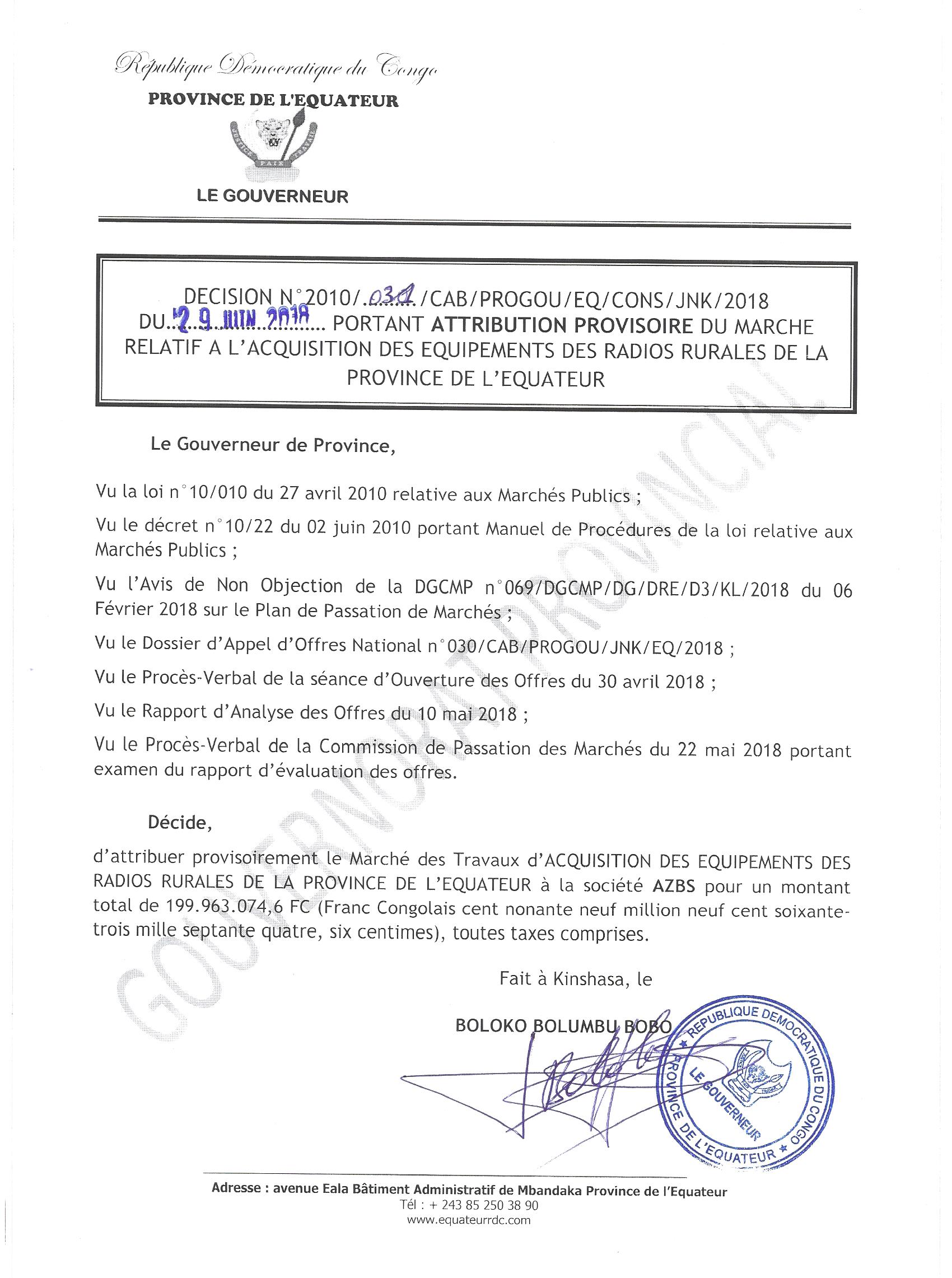 Attribution provisoire du marché relatif à l’acquisition des équipements des radios rurales de la province de l’équateur à la société AZBS.