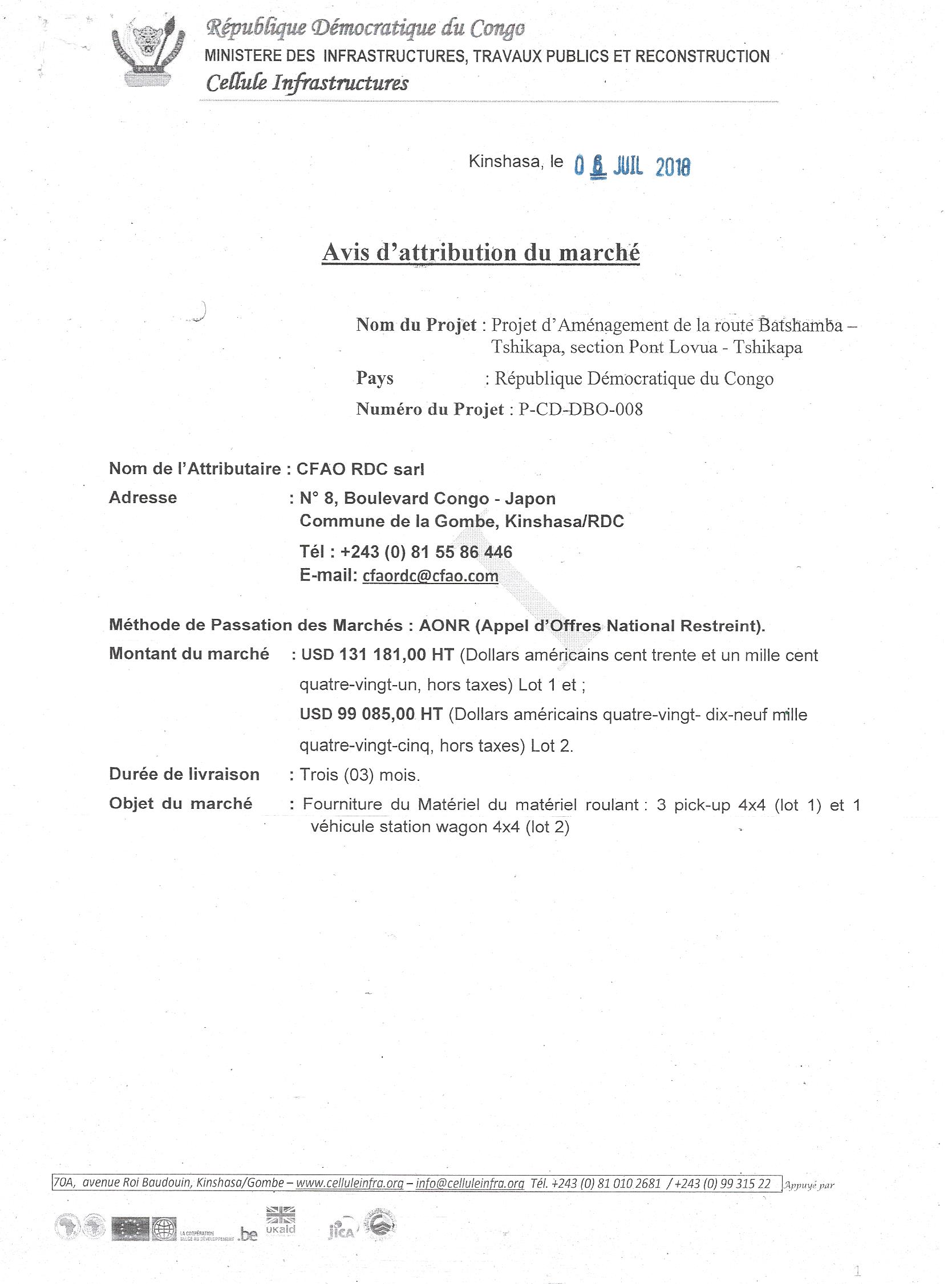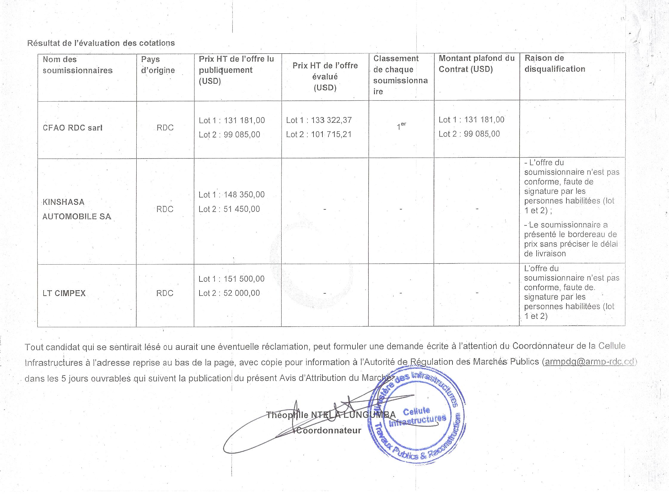 Attribution du marché relatif à la fourniture du matériel du roulant : 3 pick-up 4×4 (lot 1) et 1 véhicule station wagon 4×4 (lot 2) à la société CFAO RDC SARL.