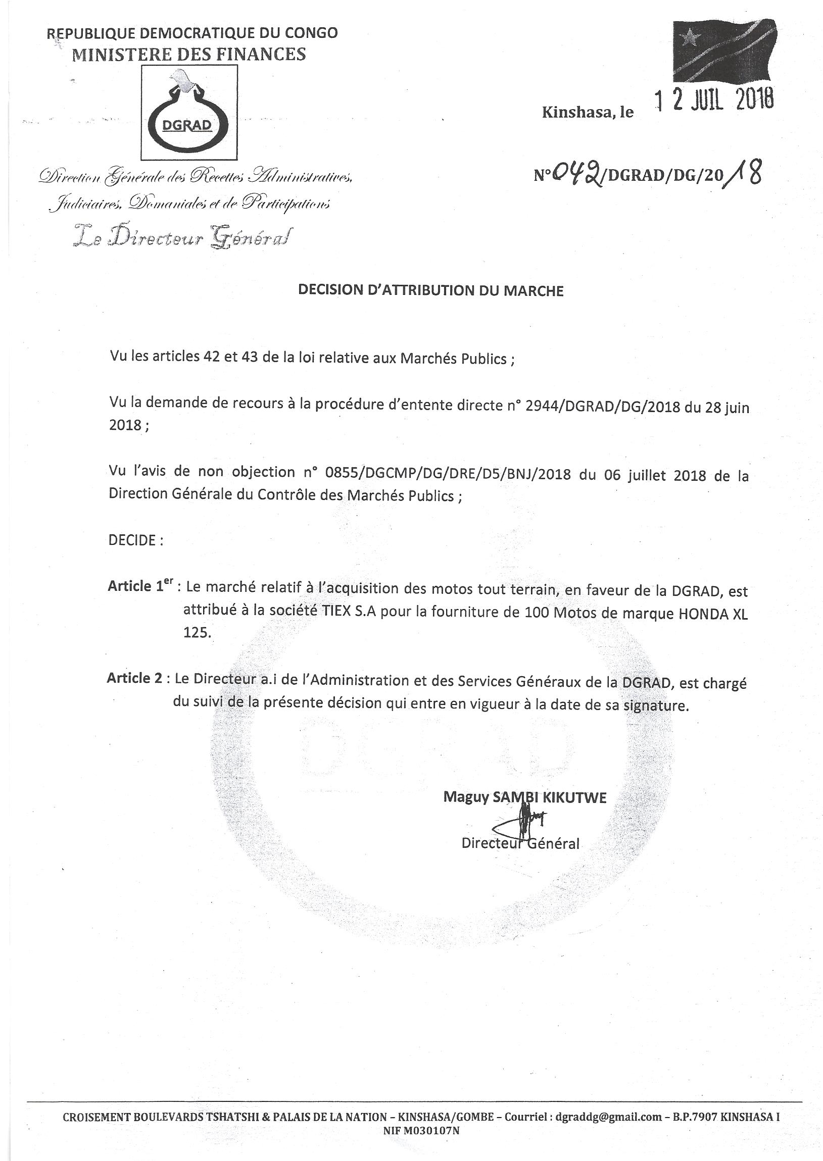 Attribution du marché relatif à l’acquisition des motos tout terrain, en faveur de la dgrad à la société TIEX S.A.