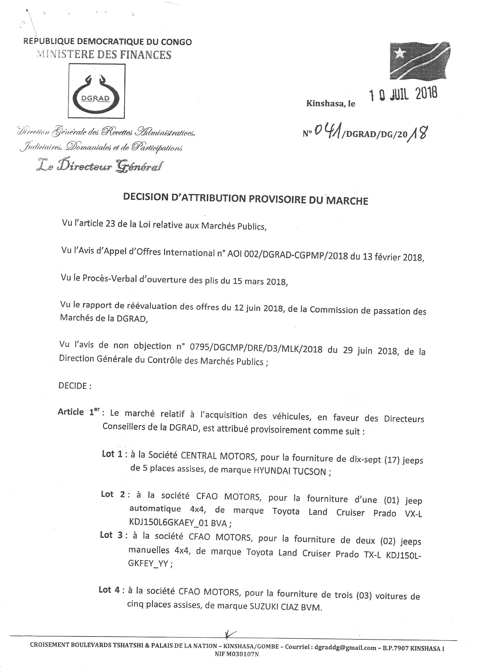 Attribution provisoire du marché relatif à l’acquisition des véhicules, en faveur des directeurs conseillers de la dgrad lot 1 à la société CENTRAL Motors et lot 2, 3 et 4 à la société CFAO MOTORS.