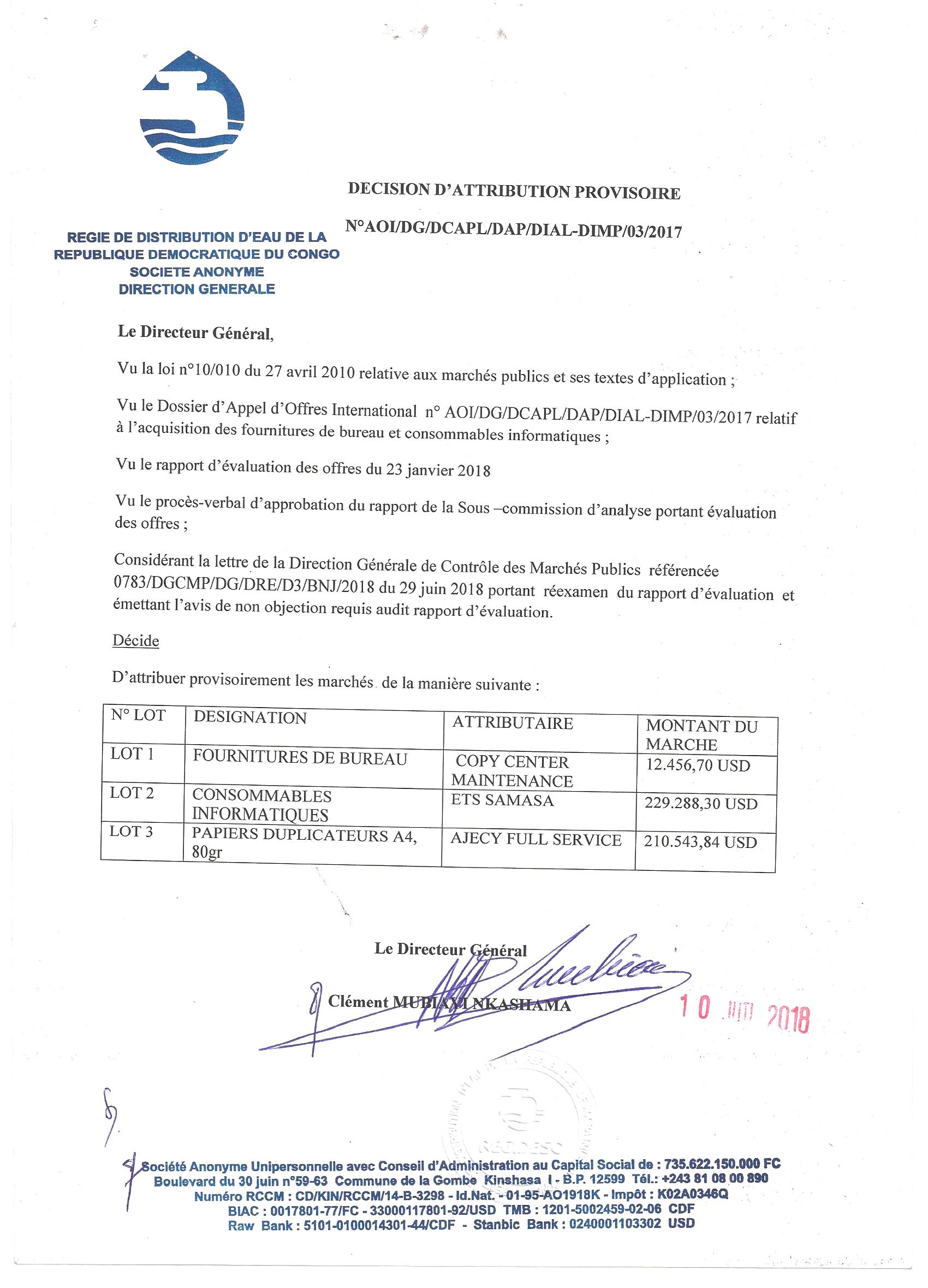 Attribution provisoire relative au marché d’acquisition des fournitures de bureau et consommables informatiques à copy center, …