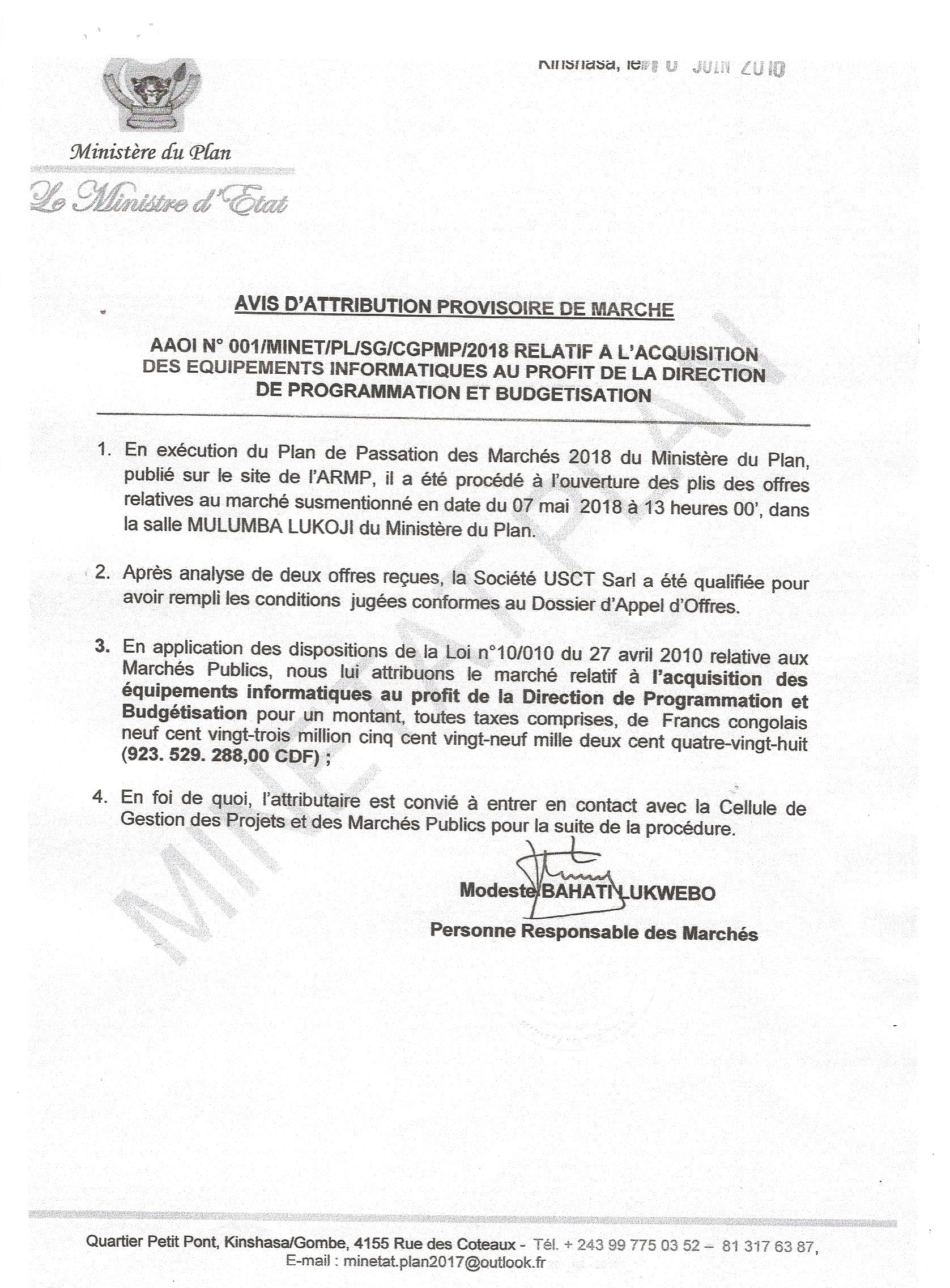 Attribution provisoire de marché relatif à l’acquisition des équipements informatiques au profit de la direction de programmation et budgétisation à la société USCT SARL.