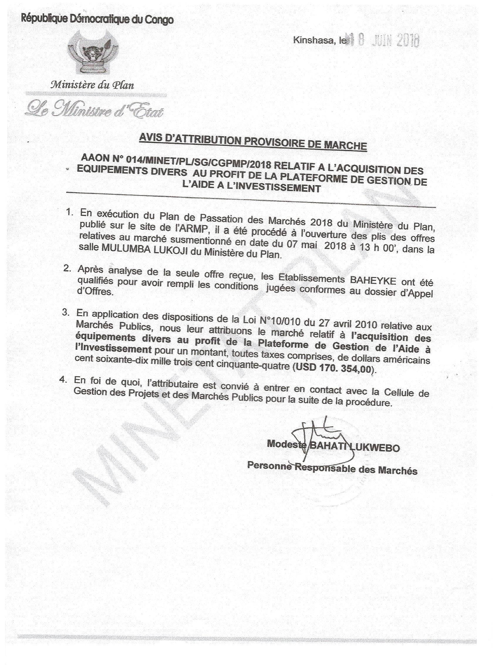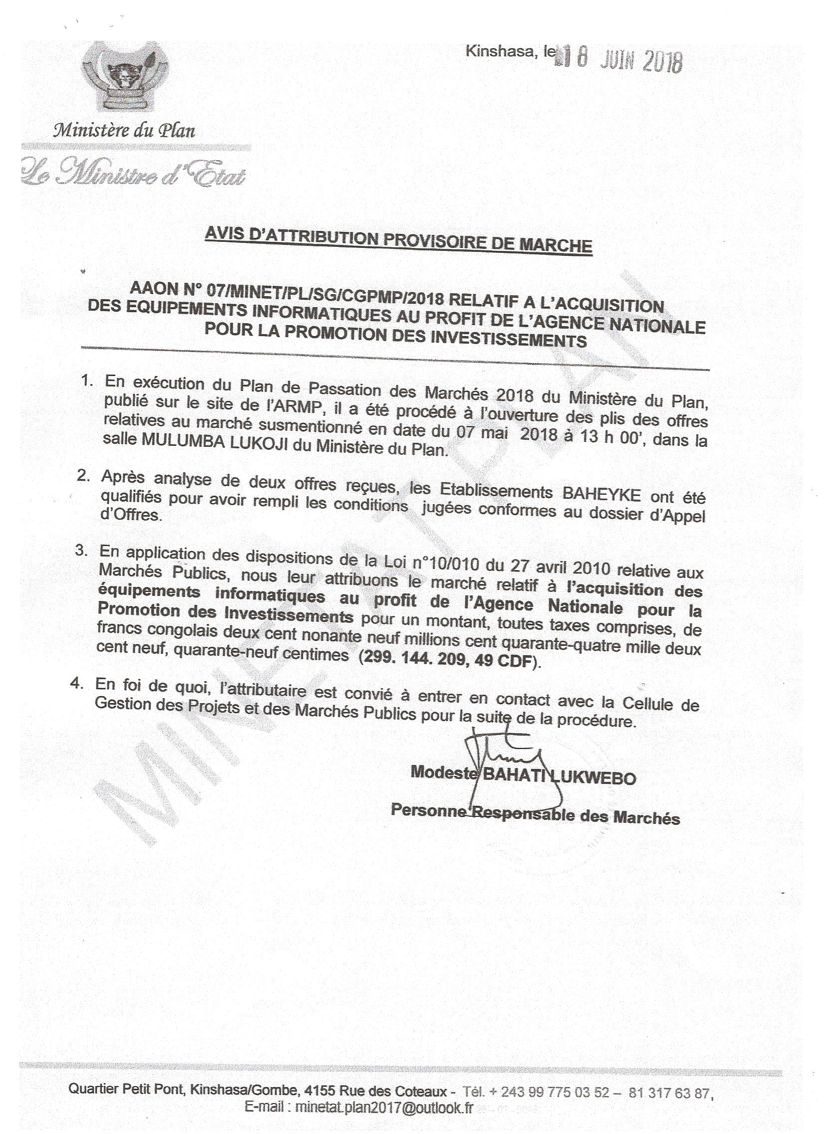 Attribution provisoire de marché relatif à l’acquisition des équipements divers au profit de la plateforme de gestion de l’aide à l’investissement à établissements BAHAYKE.
