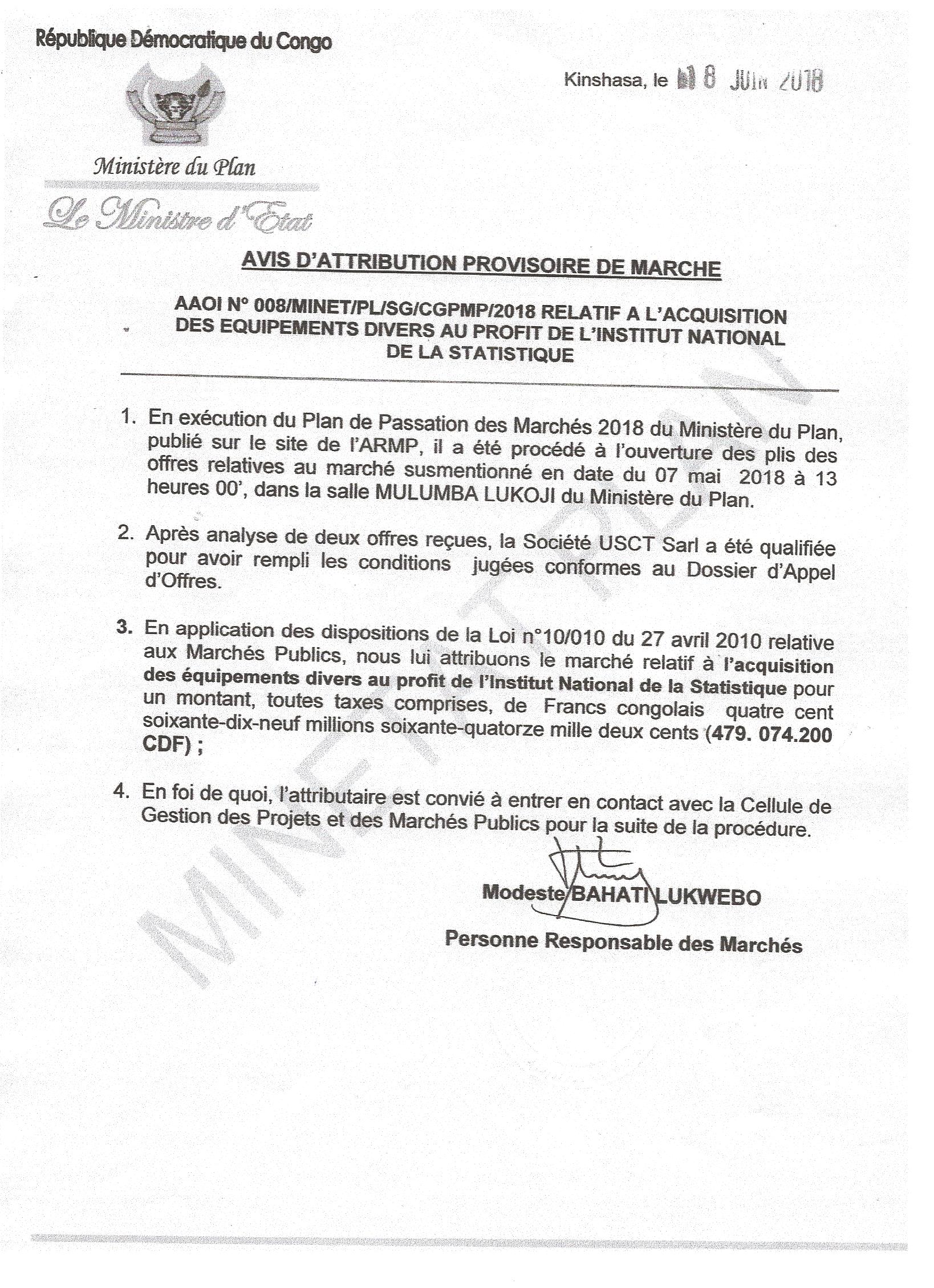 Attribution provisoire de marché relatif à l’acquisition des équipements divers au profit d’institut national de la statistique à la société USCT SARL.