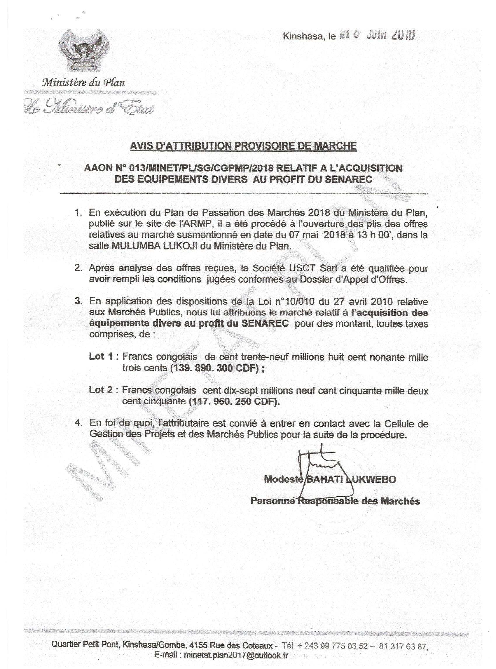 Attribution provisoire de marché relatif à l’acquisition des équipements divers au profit du senarec à la société USCT SARL.