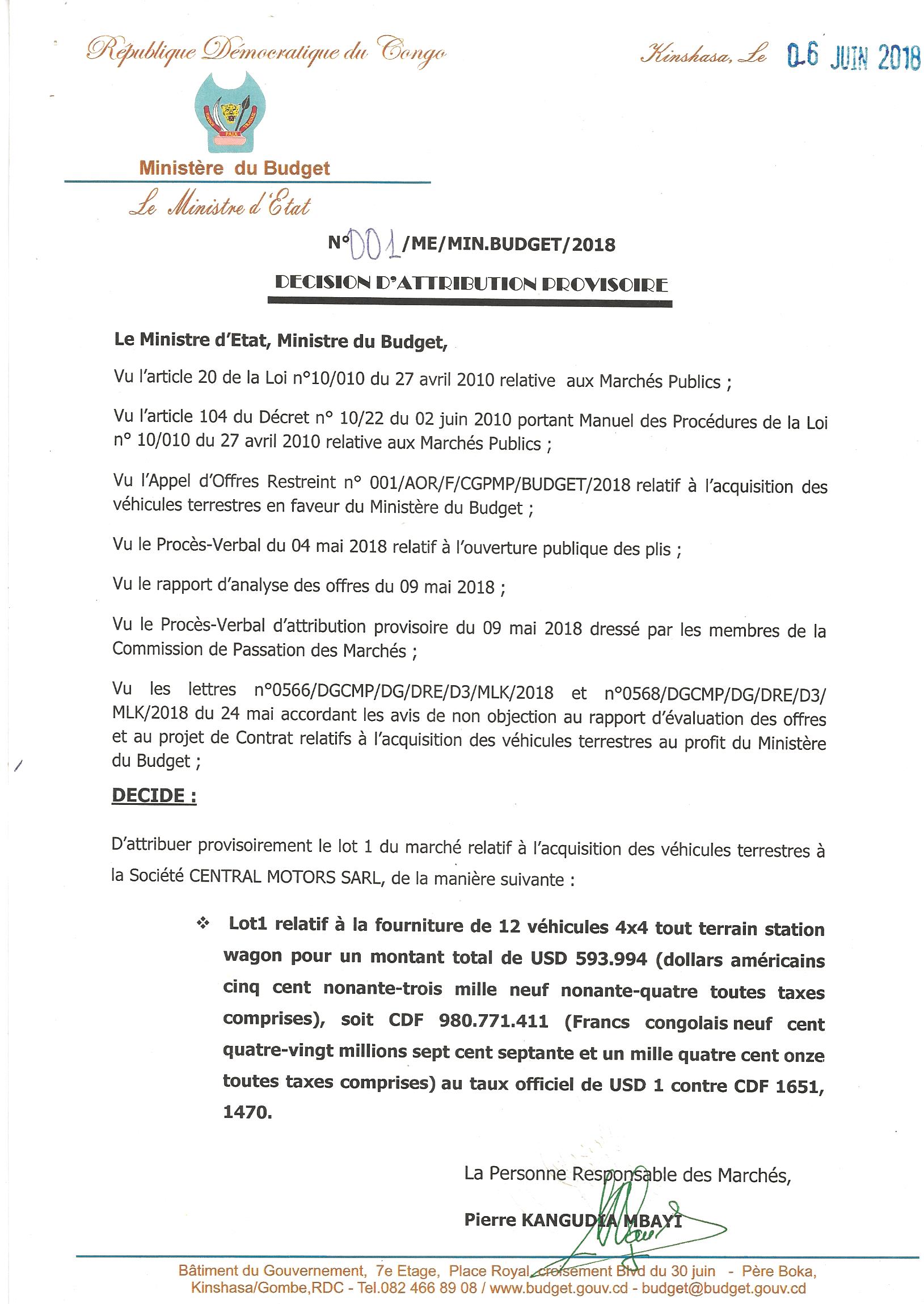 Attribution provisoire du marché d’acquisition des véhicules terrestres à la société CENTRAL MOTORS SARL.