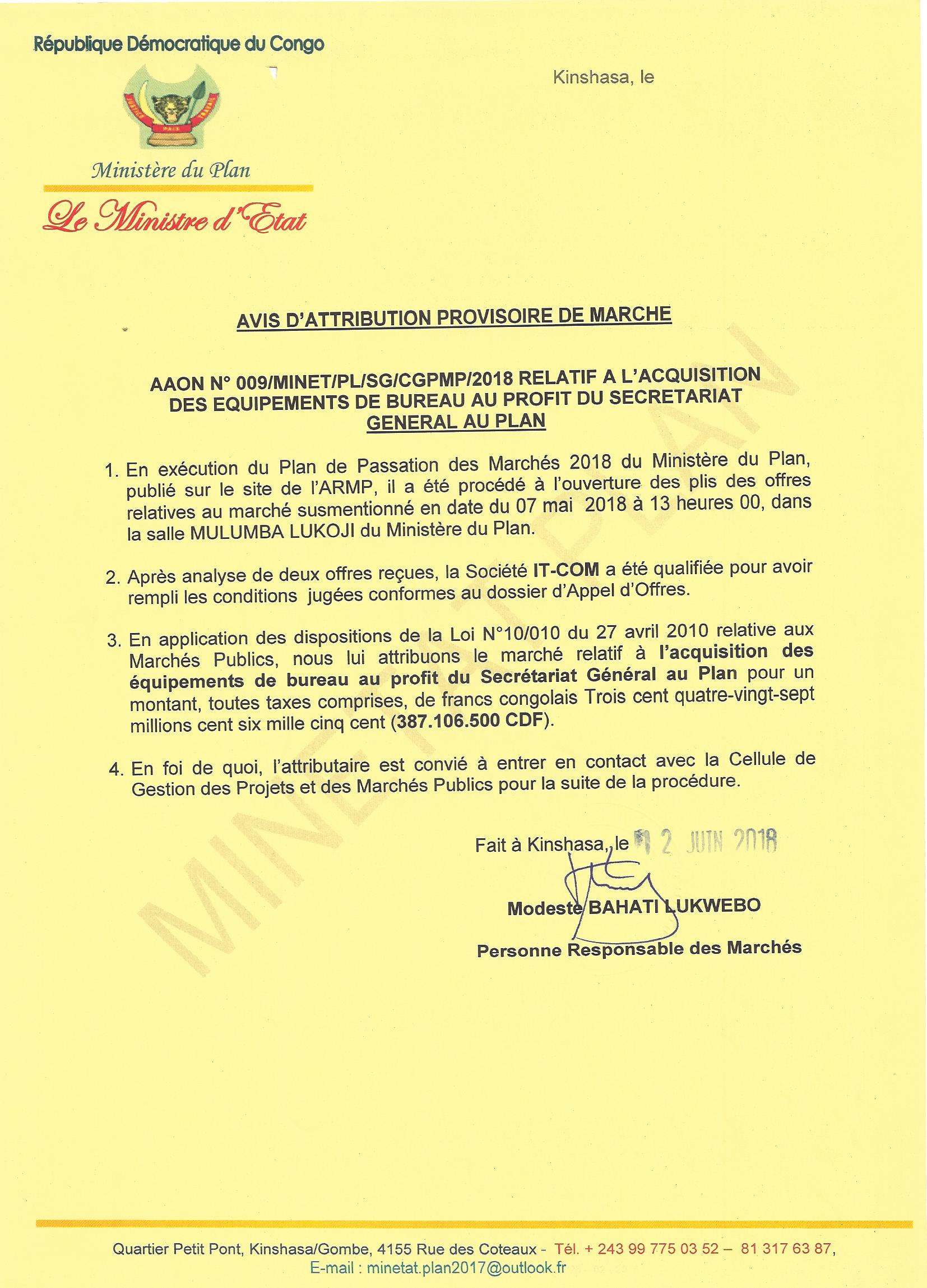 Attribution provisoire de marché relatif à l’acquisition des équipements de bureau au profit du cabinet du ministre d’état, ministre du plan à la société IT-COM.