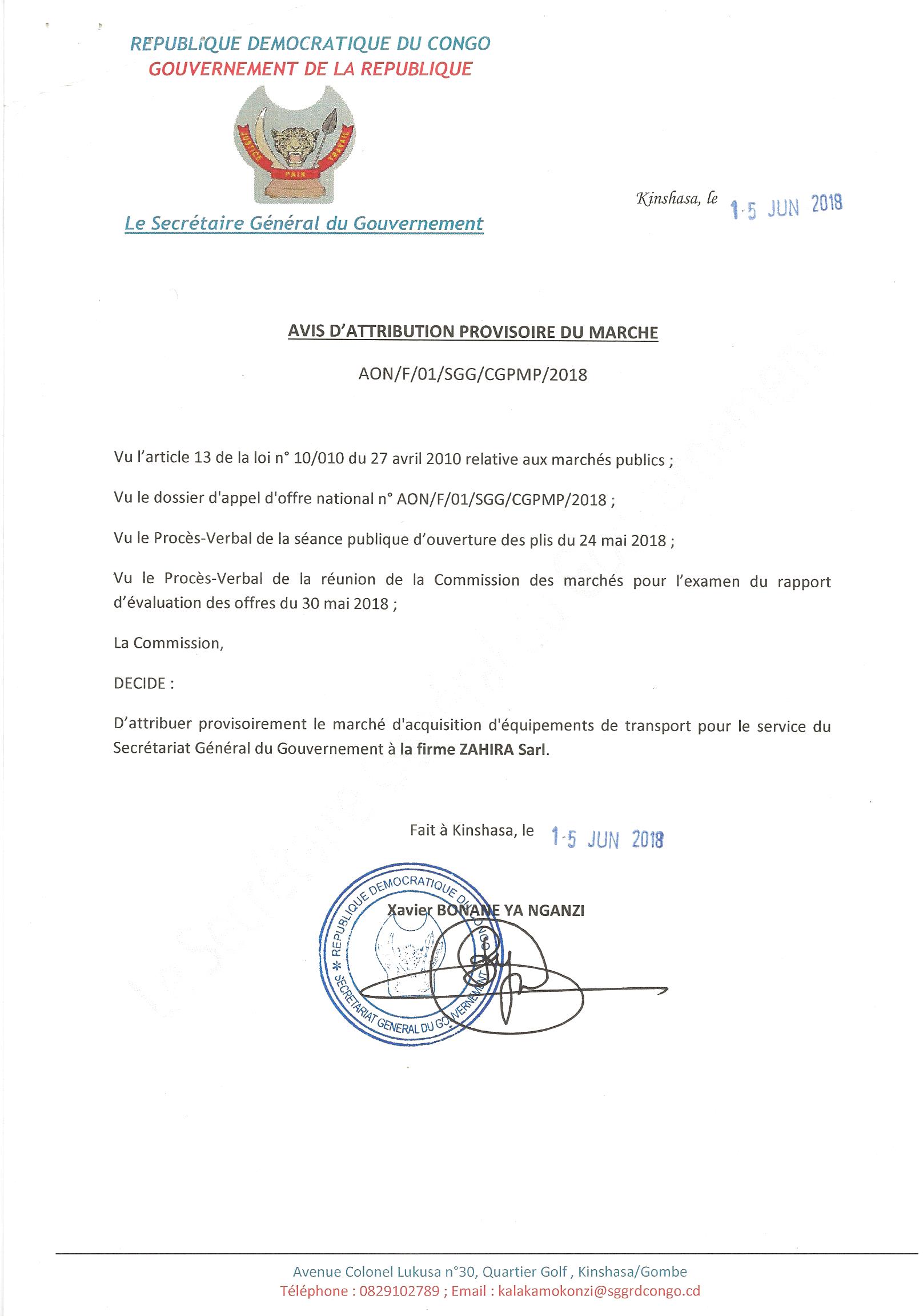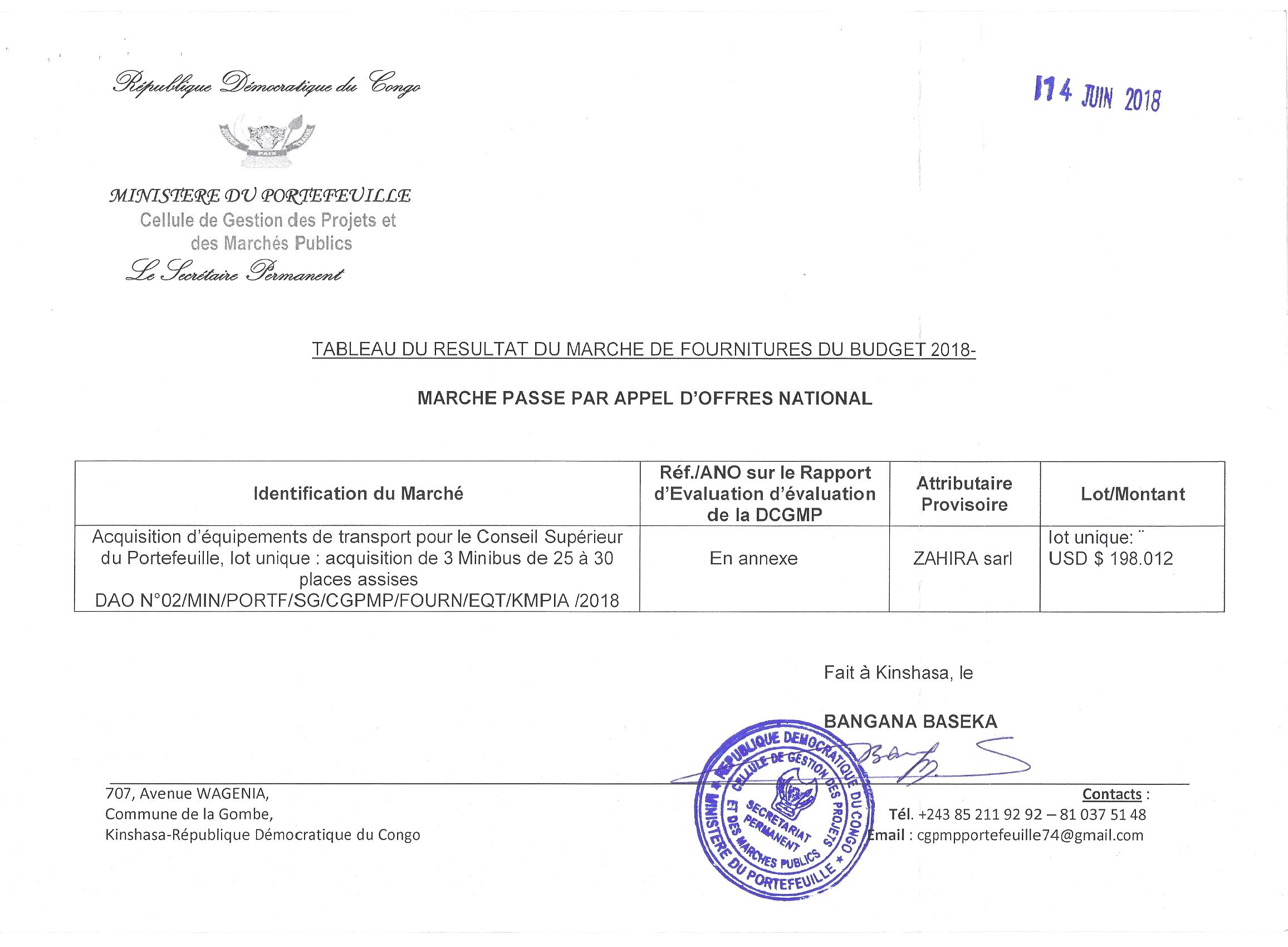 Attribution provisoire du marché d’acquisition d’équipement de transport pour le conseil supérieur du portefeuille à la société ZAHIRA SARL.