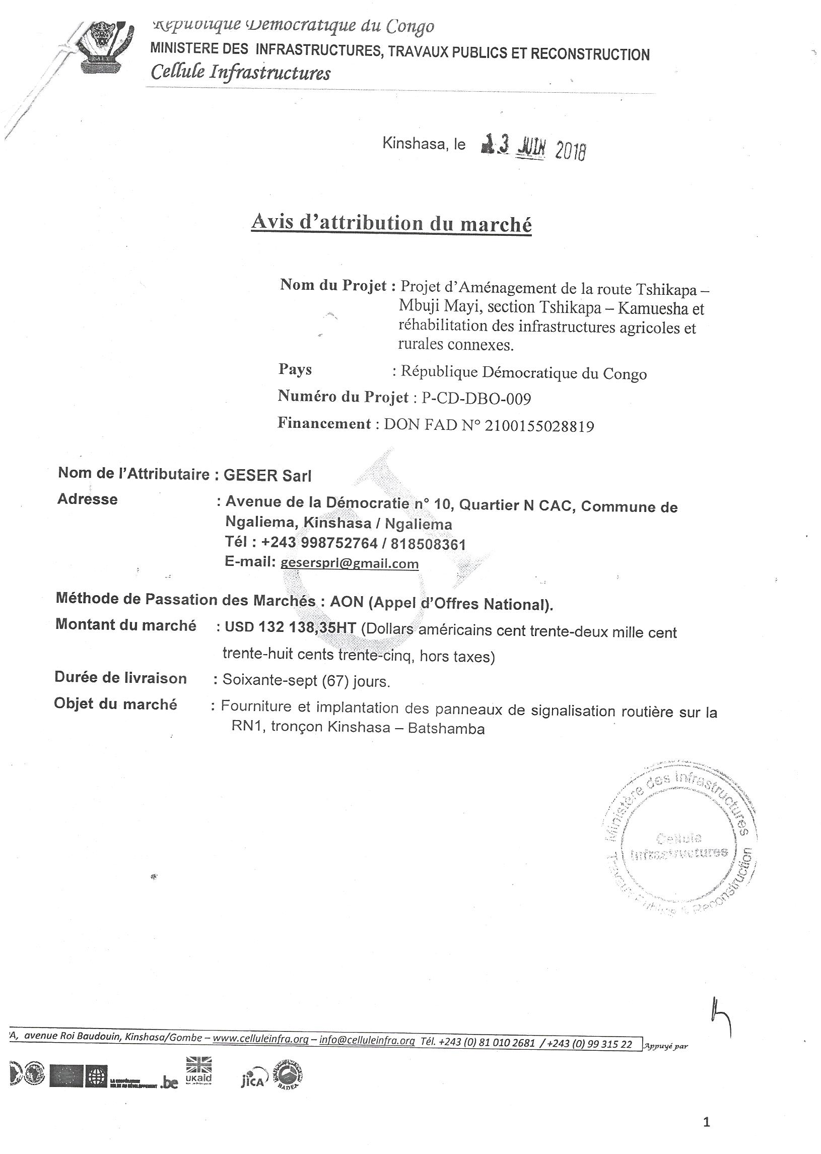Attribution du marché de fourniture et implantation des panneaux de signalisation routière sur la RN1, tronçons kinshasa-batshamba à GESER SARL.