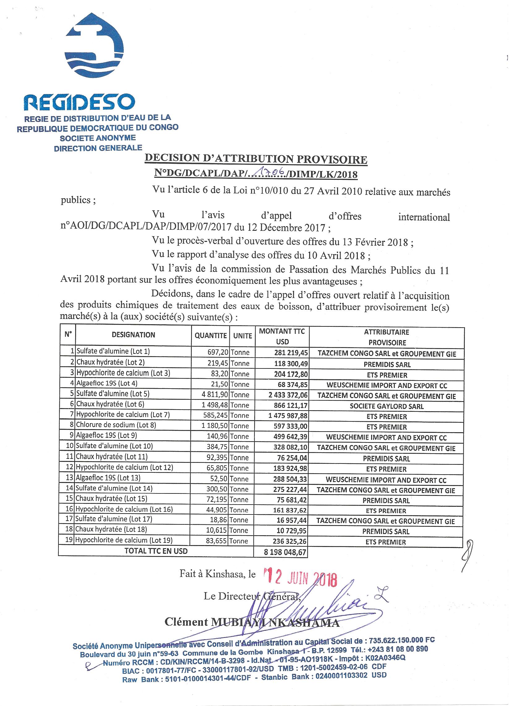 Attribution provisoire des marchés d’acquisition des produits chimiques de traitement des eaux de boisson aux sociétés TAZCHEM Congo SARL et groupement gie, premidis SARL, Ets premier,…