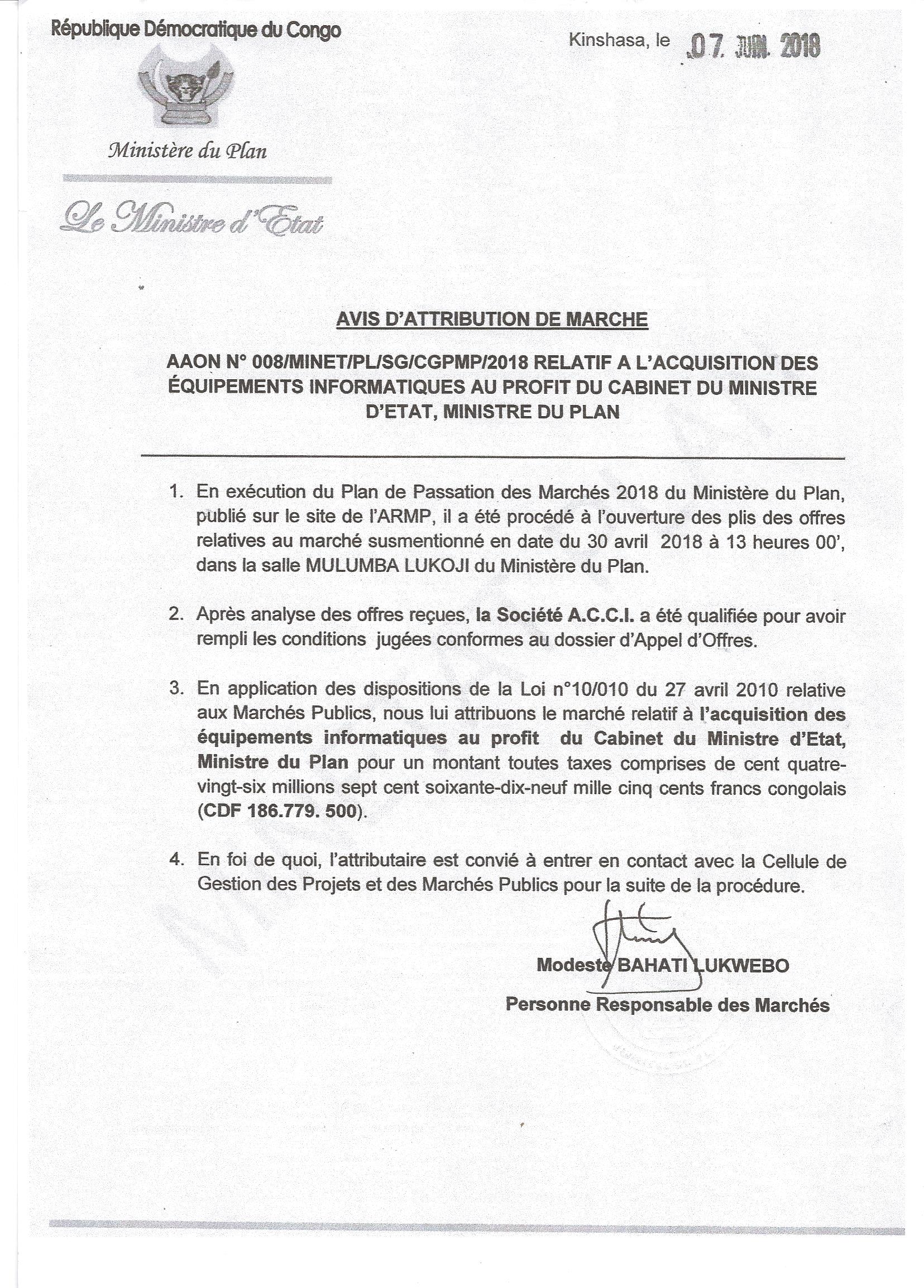 Attribution de marché relatif à l’acquisition des équipements informatiques au profit du cabinet du ministre d’état, ministre du plan à la société A.C.C.I.