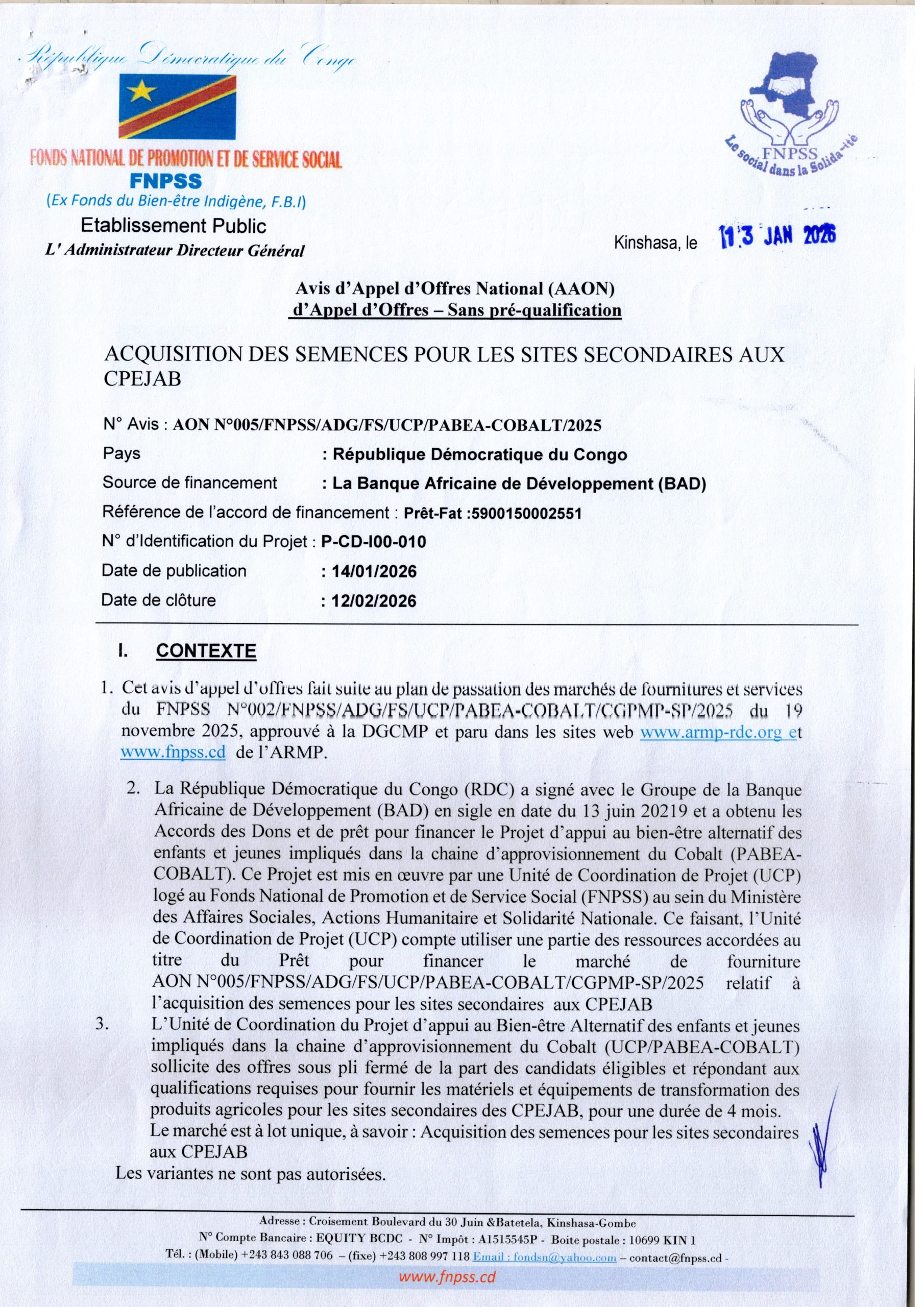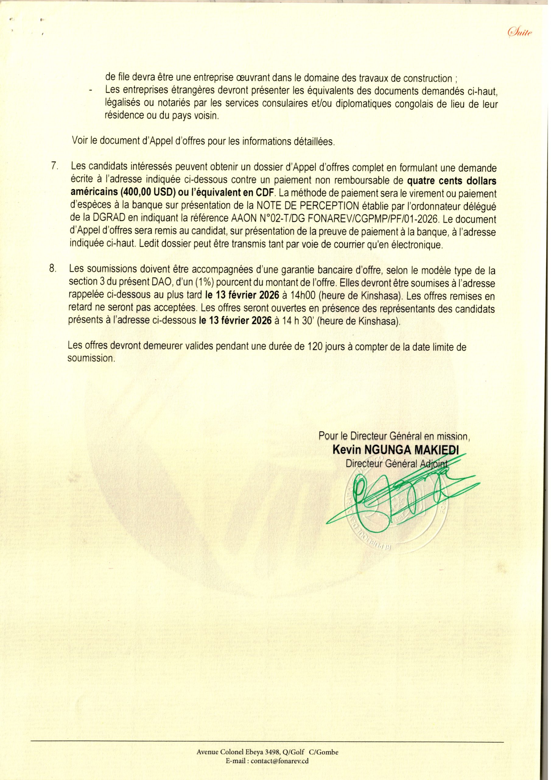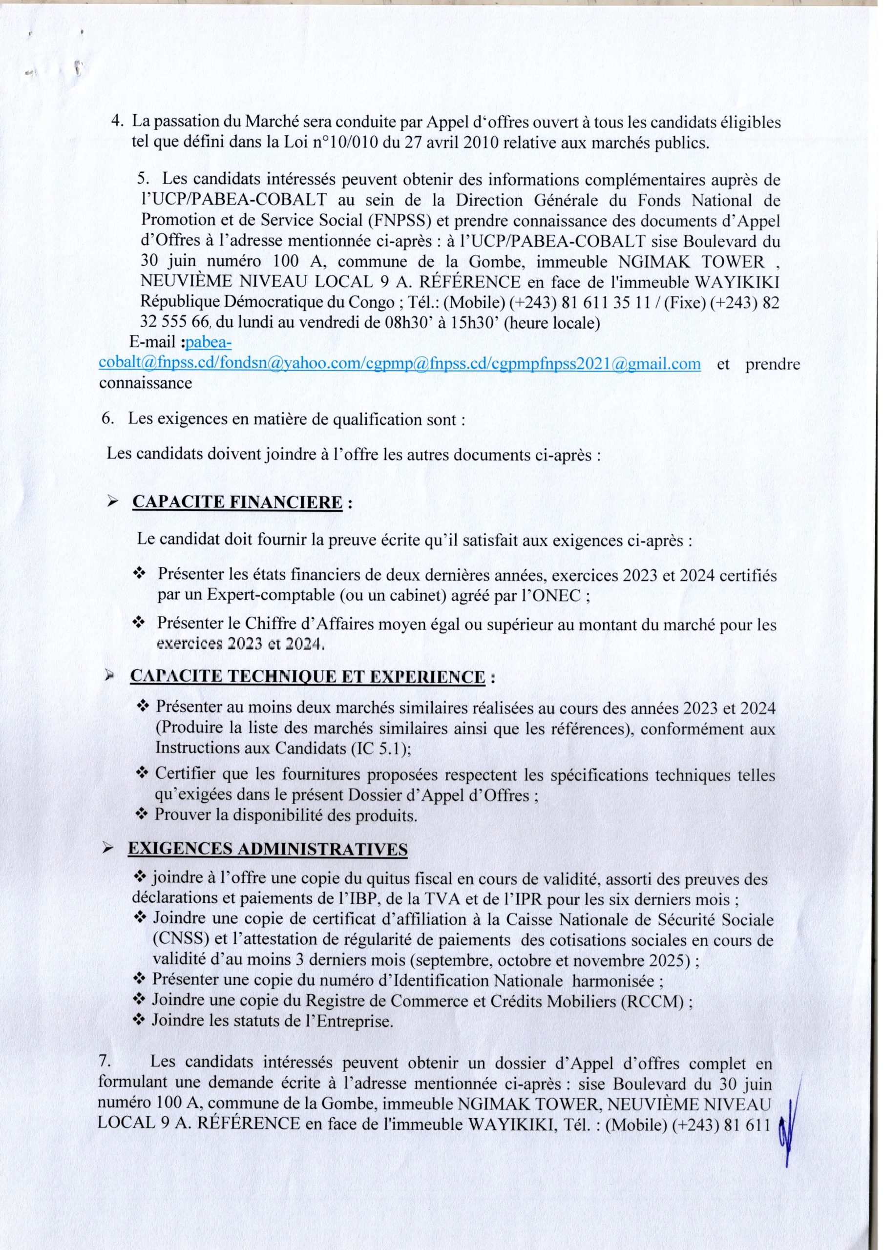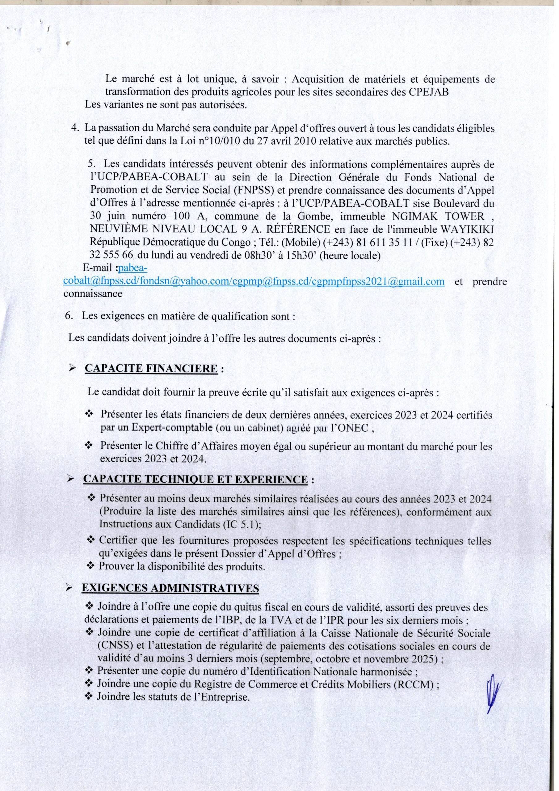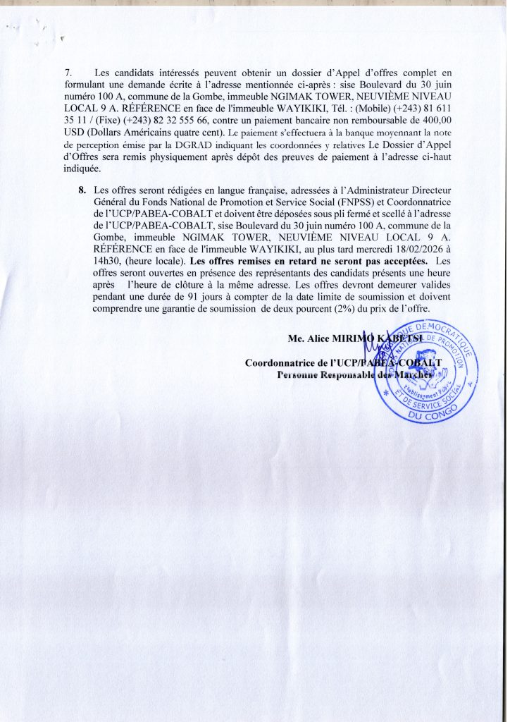 Attribution provisoire accordée à la société “CPCS” relative au marché de recrutement d’un consultant firme chargé la réalisation de l’étude de faisabilité des projets de partenariat Public-Privé portant sur l’organisation et la gestion de la collecte de la redevance sur la charge à l’essieu en RDC, dans le cadre du projet PACT.