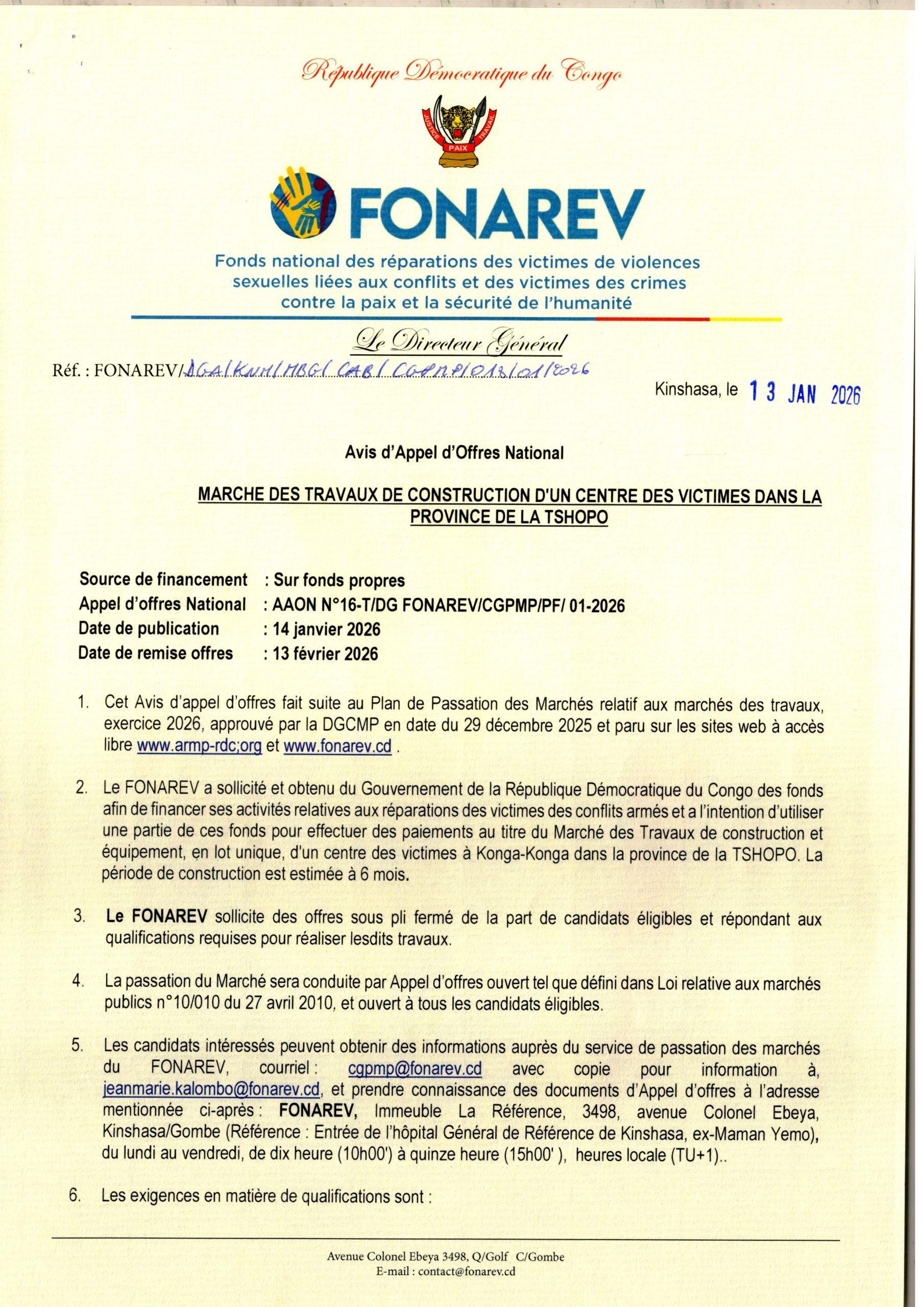 Travaux de Construction d’un centre des victimes dans la Province de la Tshopo.