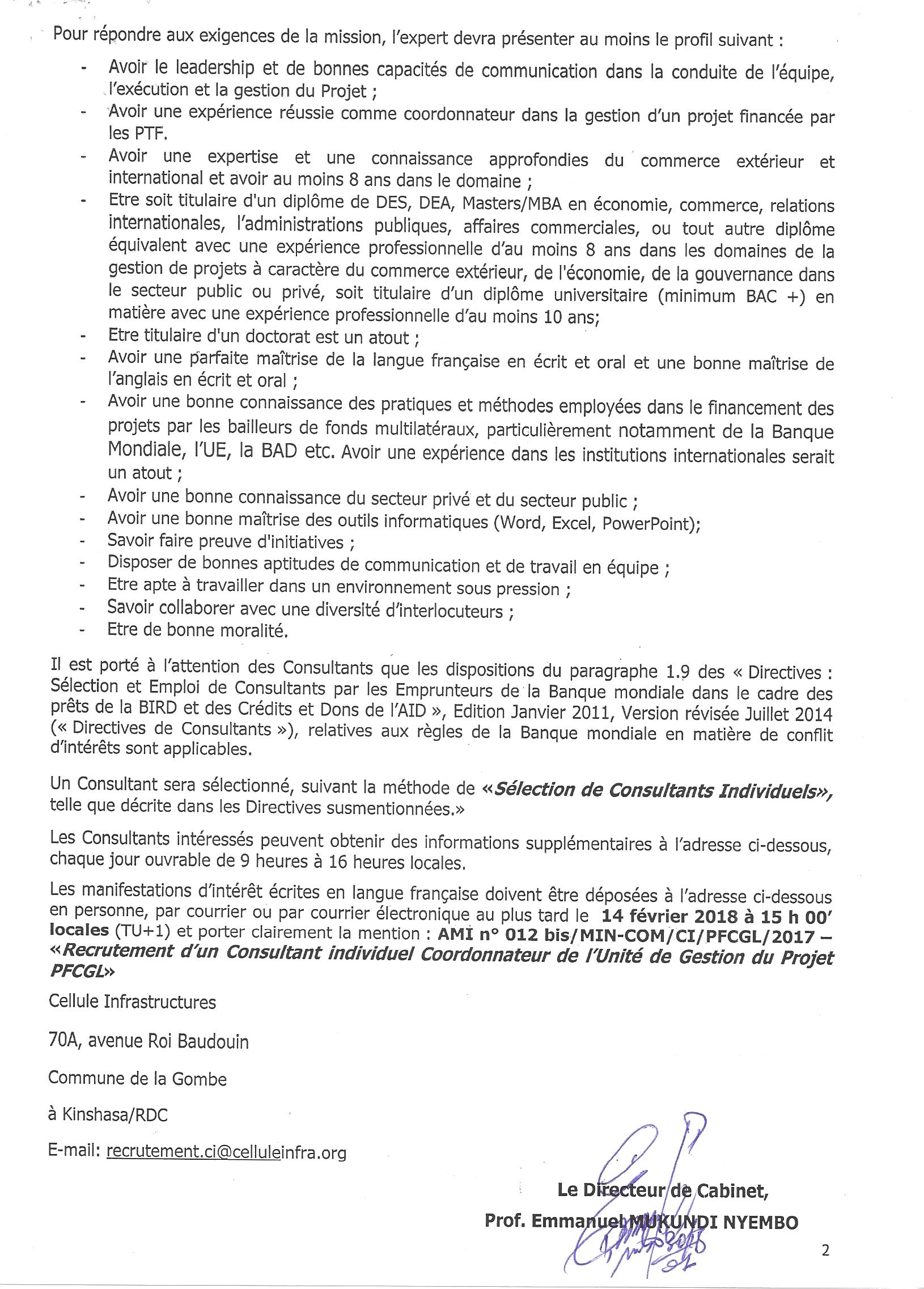 Recrutement d’un Consultant (Firme) chargé du Plan Directeur d’alimentation en eau potable des villes de Boma et Kinshasa -Périurbain (axe Est) – horizon 2035 et l’APS du programme d’investissement prioritaire