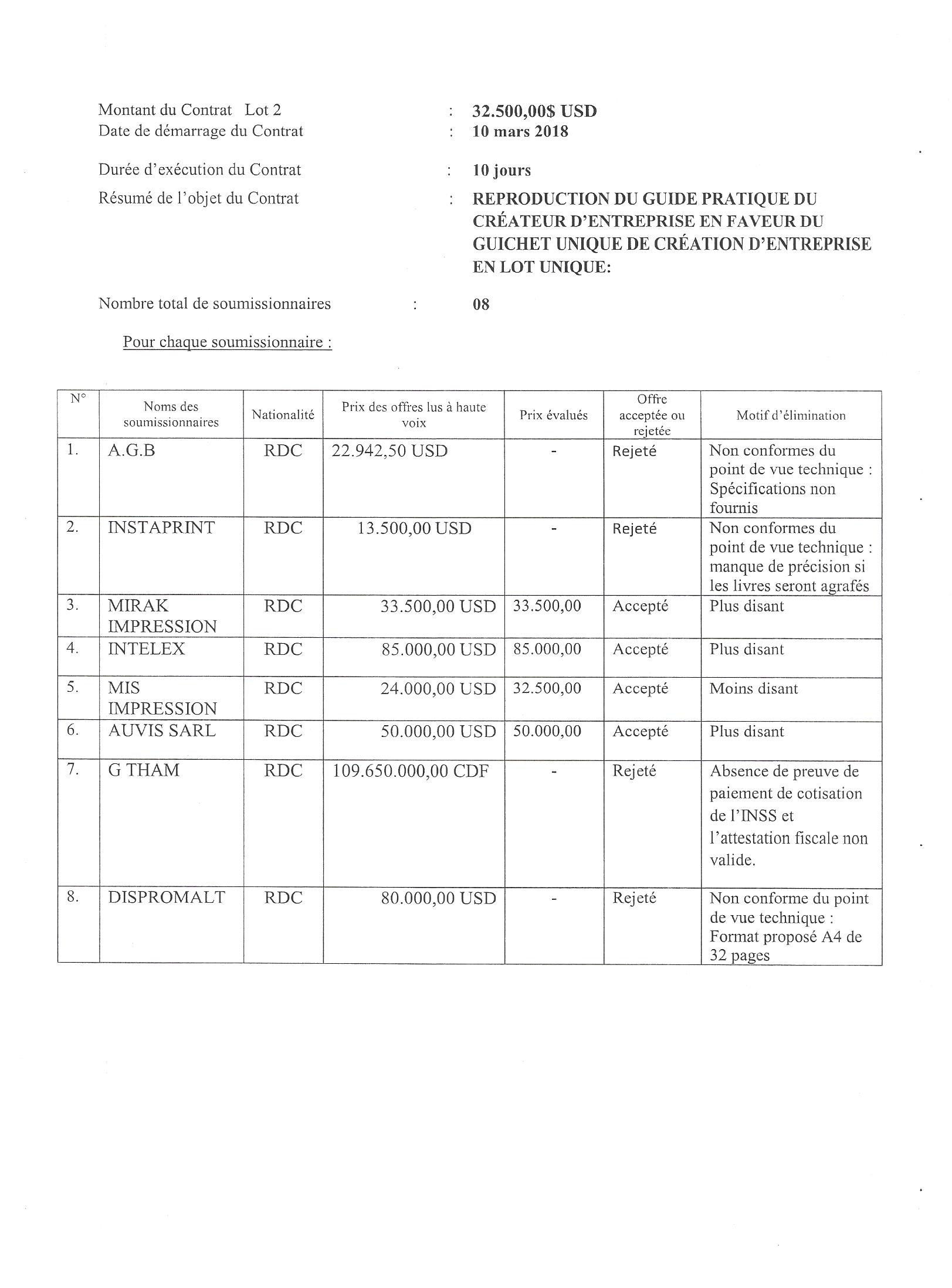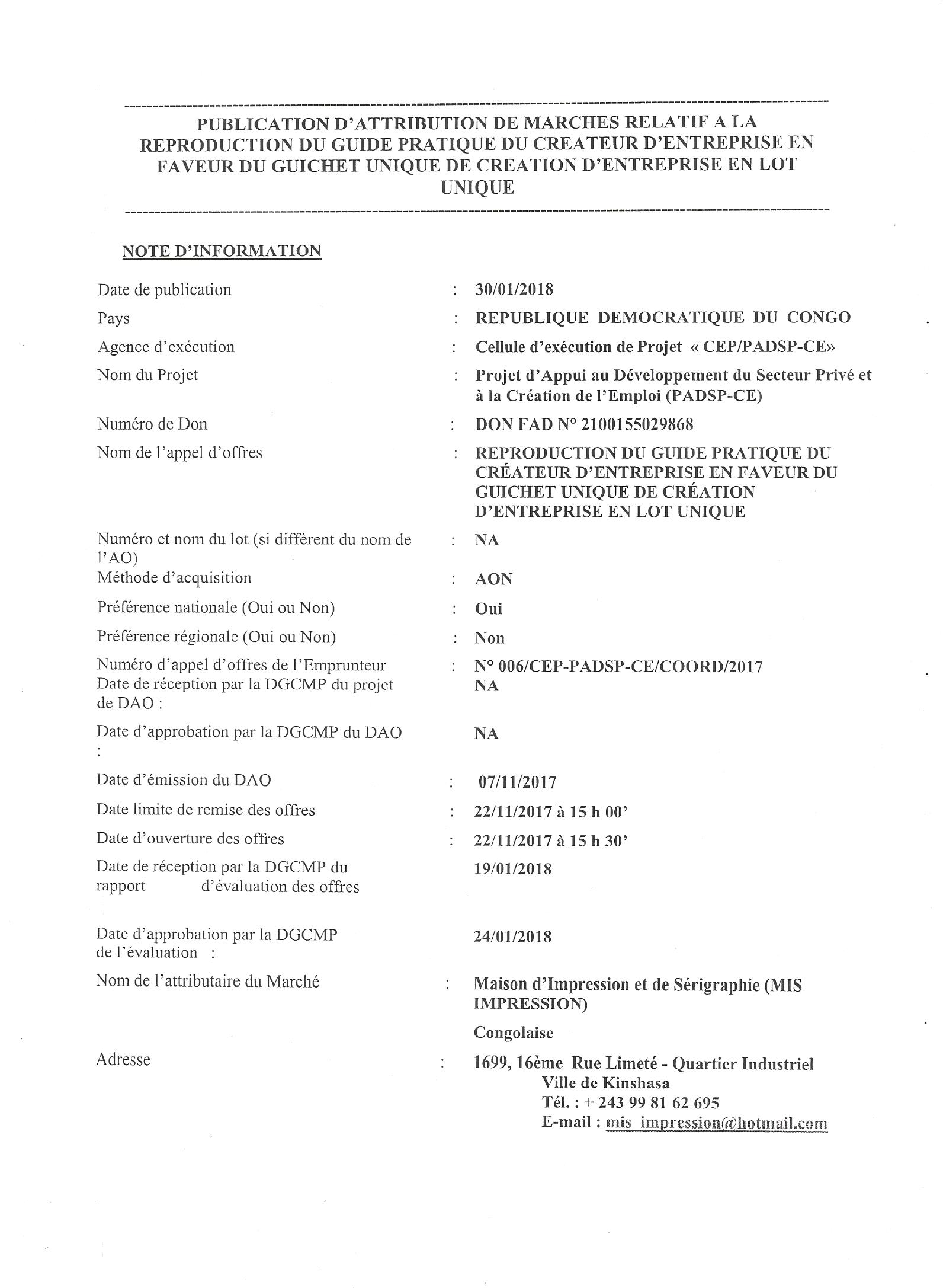 Marchés relatif à la reproduction du guide pratique du créateur d’entreprise en faveur du guichet unique de création d’entreprise en lot unique à la maison d’impression et de sérigraphie