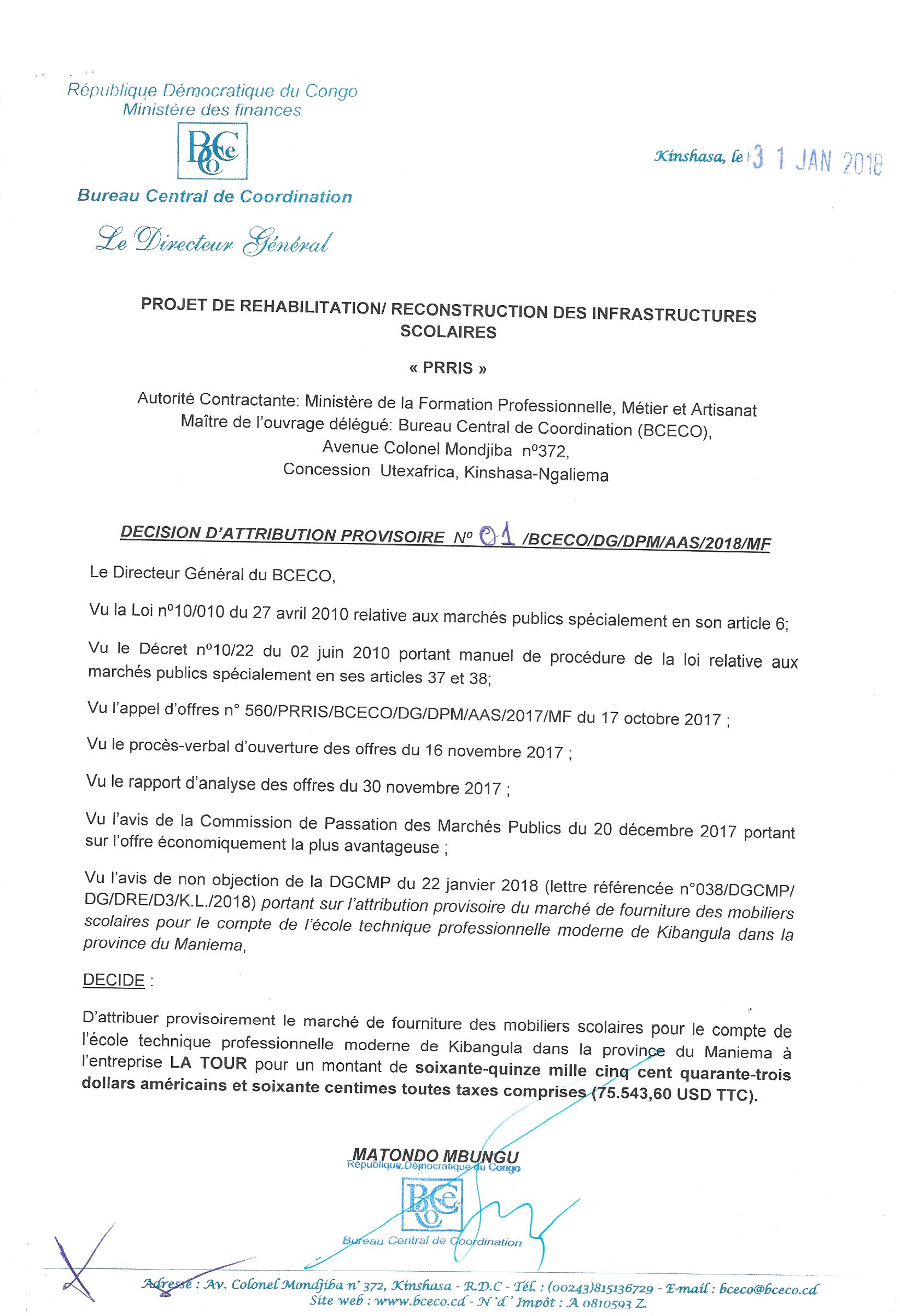 Attribution provisoire du marché de fourniture des mobiliers scolaires pour le compte de l’école technique professionnelle moderne de kibangula dans la province du Maniema à l’entreprise LA TOUR.