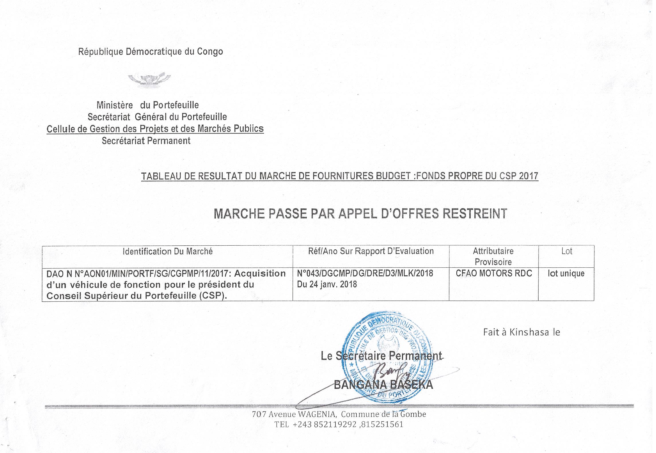 Attribution provisoire du marché d’acquisition d’un véhicule de fonction pour le président du conseil supérieur du portefeuille à la société CFAO MOTORS RDC.