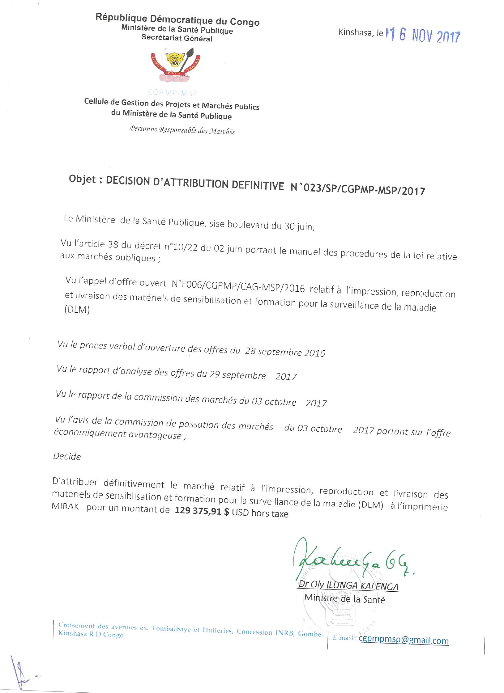 Marché relatif à l’impression, reproduction et livraison des matériels de sensibilisation et formation pour la surveillance de la maladie à L’IMPRIMERIE MIRAK.