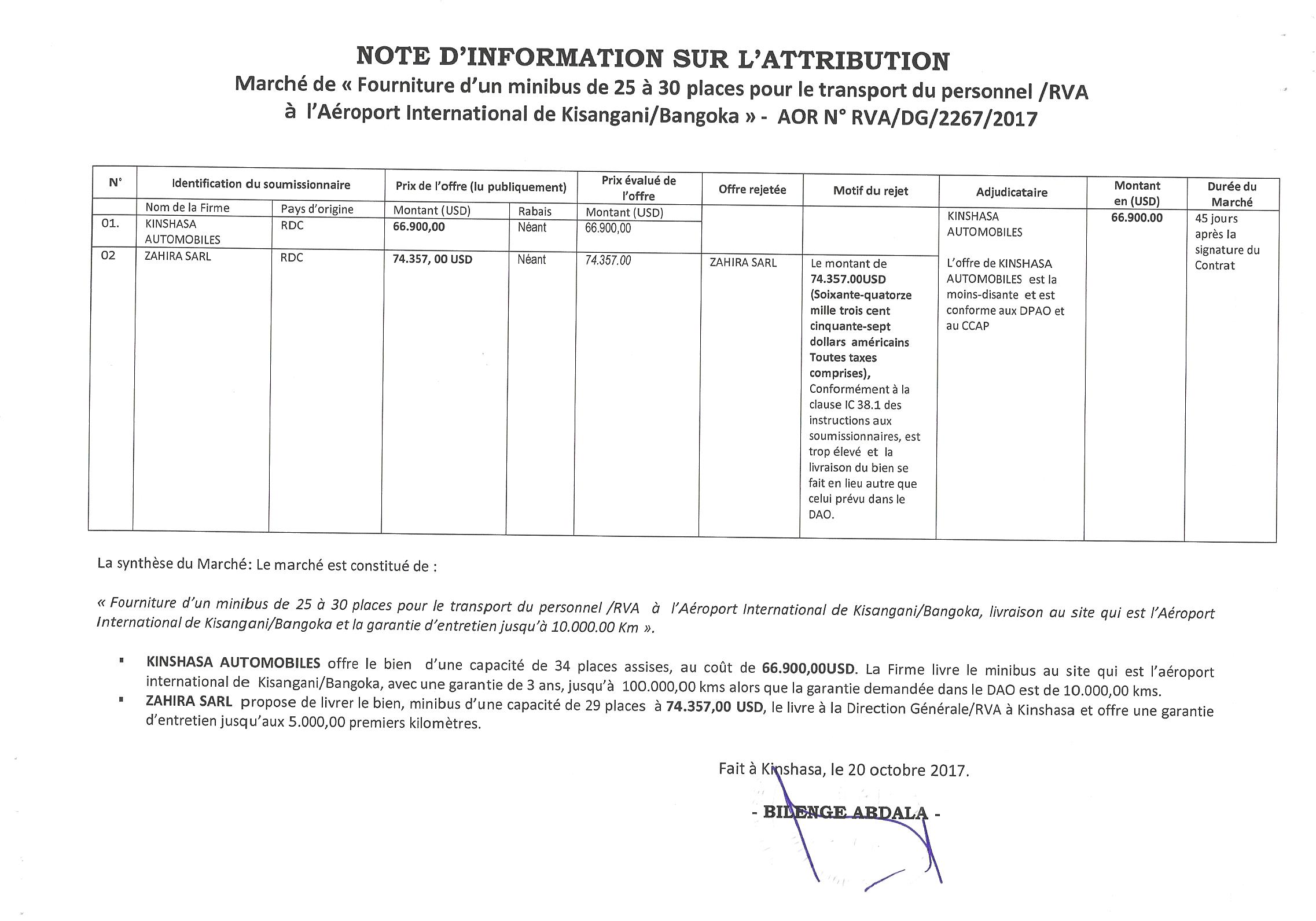 Attribution de marché de fourniture d’un minibus de 25 à 30 places pour le transport du personnel / RVA à l’aéroport international de Kisangani/bangoka à LA SOCIÉTÉ ZAHIRA SARL.