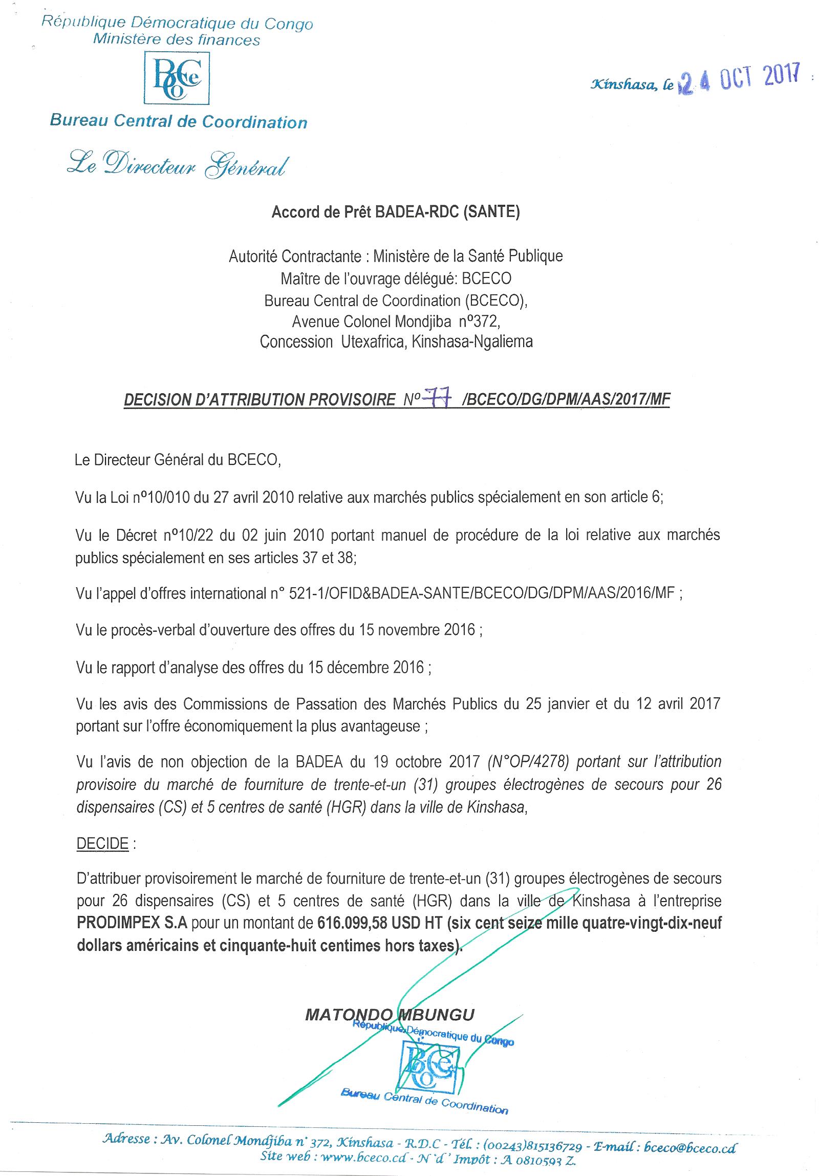 Attribution provisoire du marché de fourniture de trente-et-un groupes électrogènes de secours pour 26 dispensaires et 5 centres de santé dans la ville de Kinshasa à L’ENTREPRISE PRODIMPEX S.A