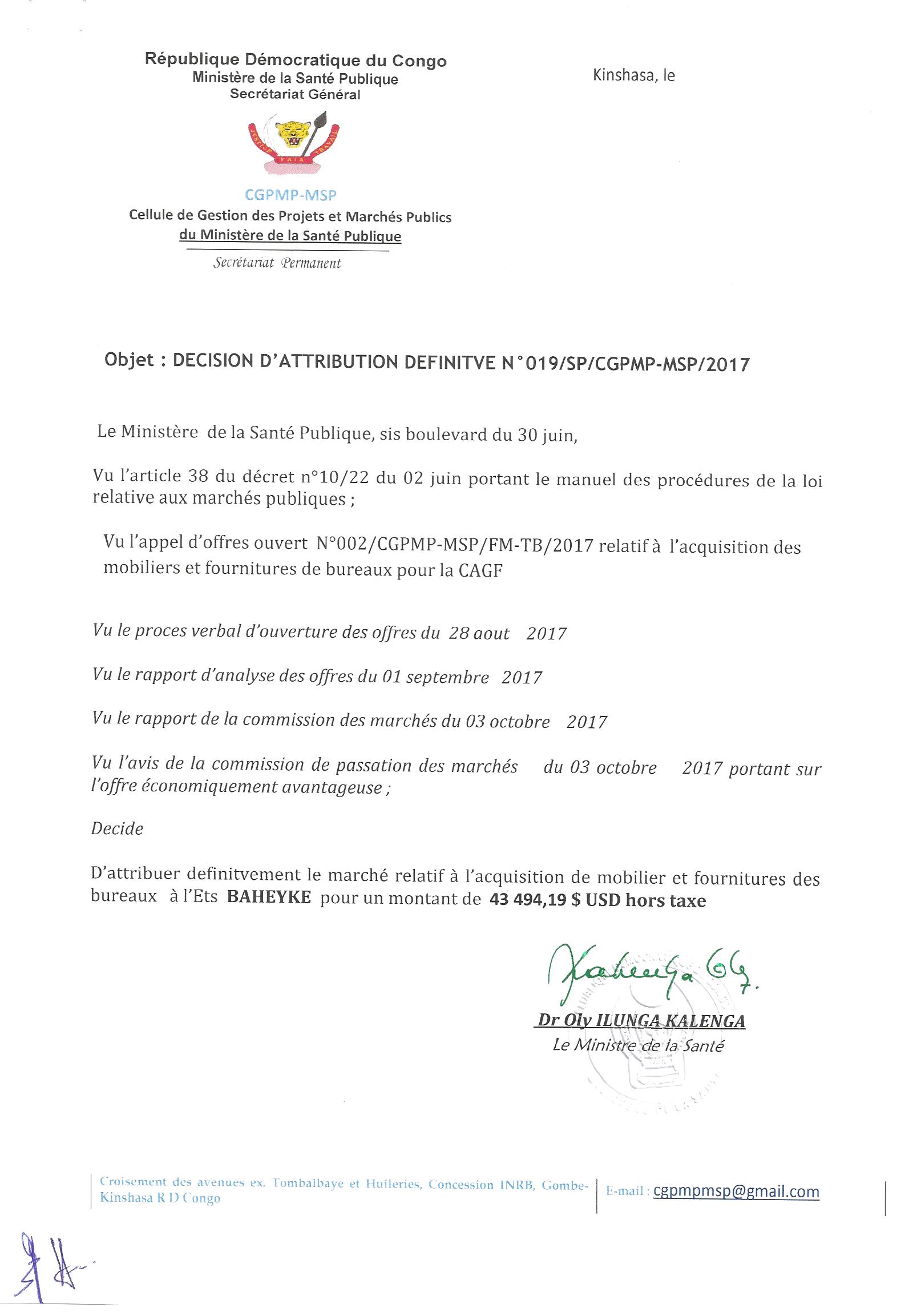 Attribution définitive du marché relatif à l’acquisition de mobilier et fournitures des bureaux à L’ETS BAHEYKE.