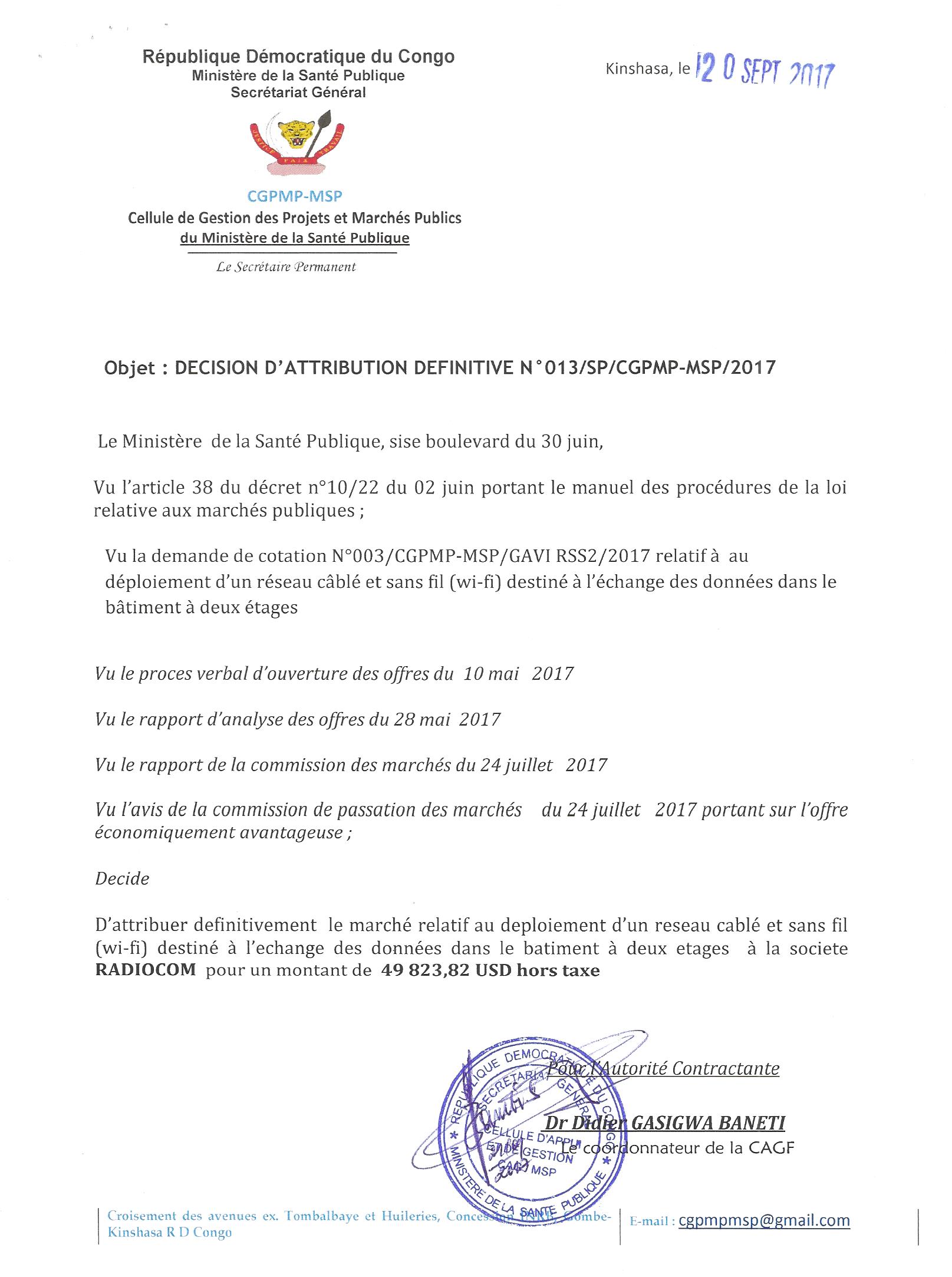 Attribution du marché de fourniture de 13 canots rapides et 66bmoteurs hors bords pour les services du ministère de la santé publique à LA SOCIÉTÉ PRODIMPEX.