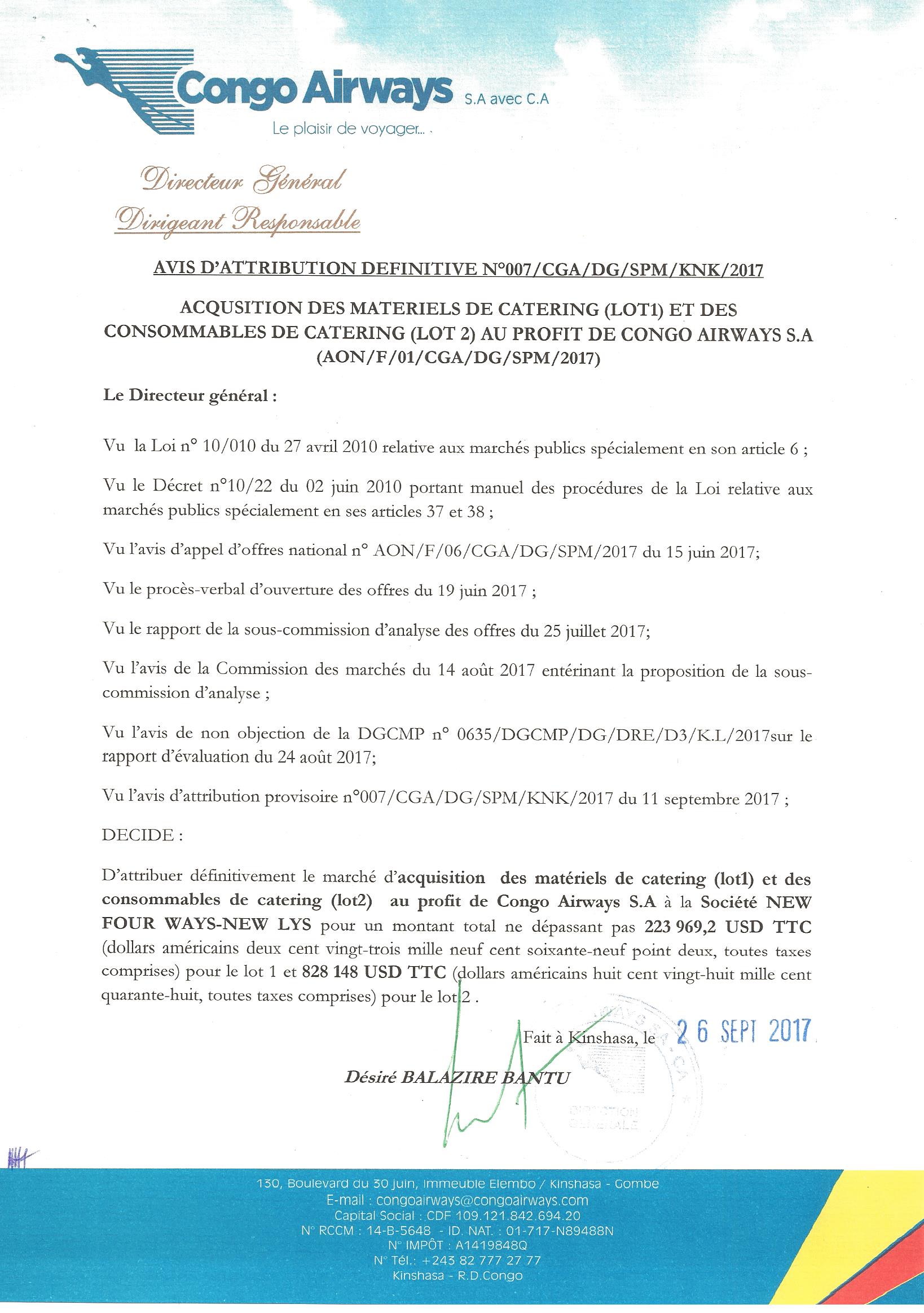 Attribution définitive du marché d’acquisition des matériels de catering (lot1) et des consommables de catering (lot2) au profit de Congo Airways S.A. à LA SOCIÉTÉ NEW FOUR WAYS-NEW LYS.