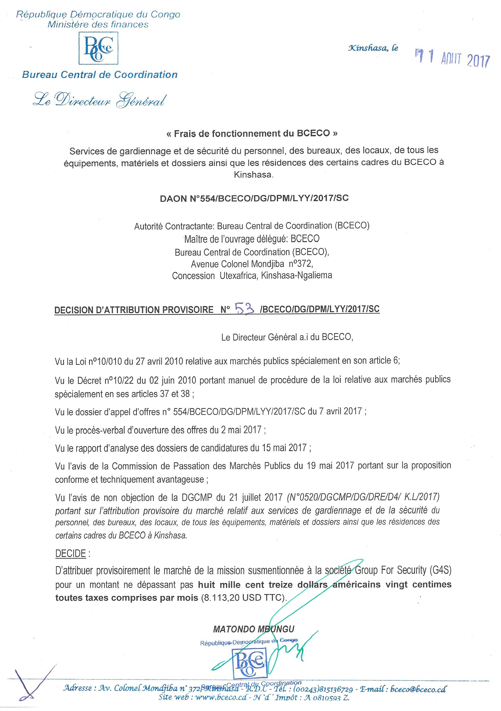 Marché des services de gardiennage et de sécurité du personnel, des bureaux, des locaux, de tous les équipements, matériels et dossiers ainsi que les résidences des certains cadres du bceco à Kinshasa à la société group for …