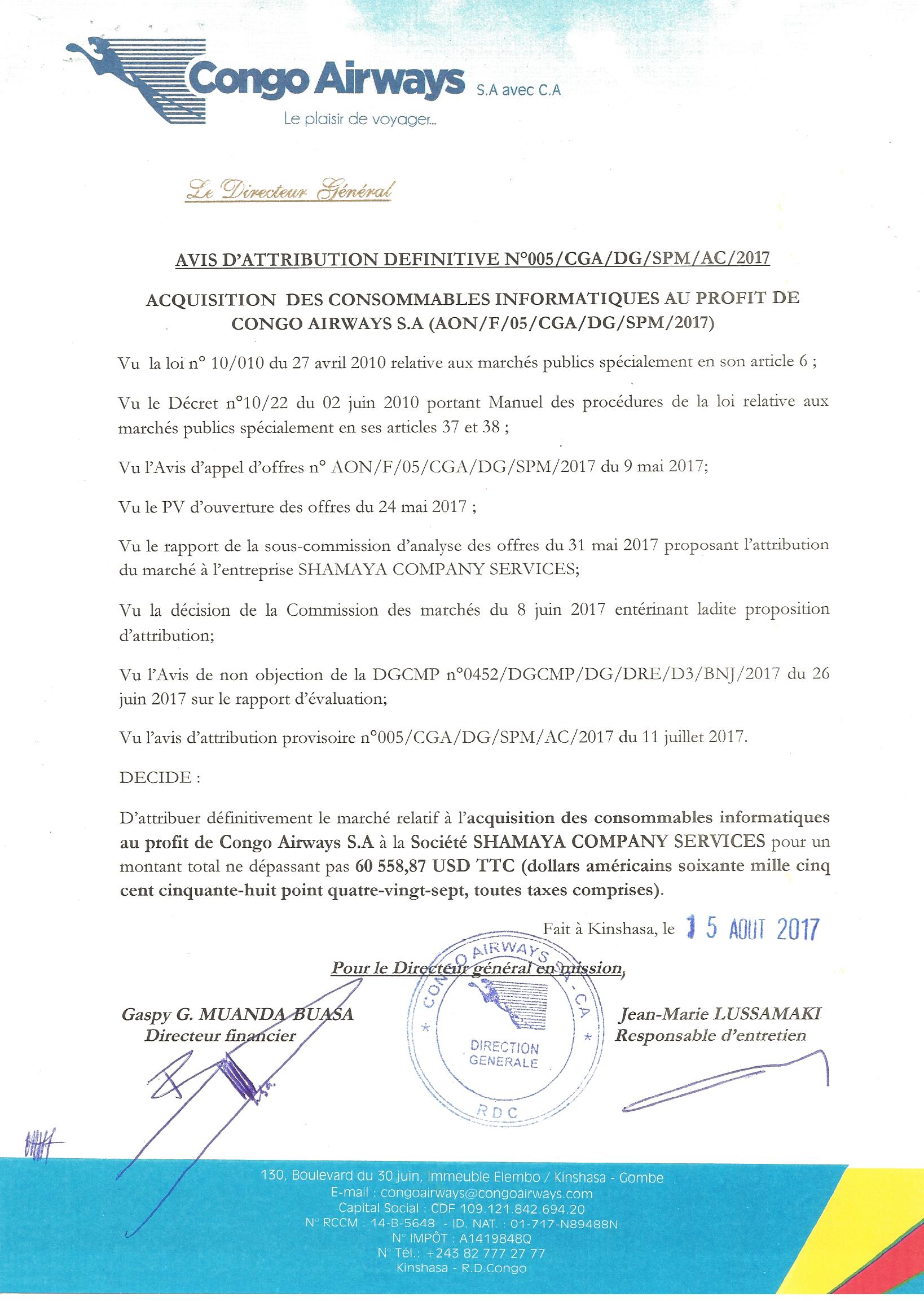 Attribution définitive du marché des consommables informatiques au profit de Congo Airways à LA SOCIÉTÉ SHAMAYA COMPANY SERVICES.