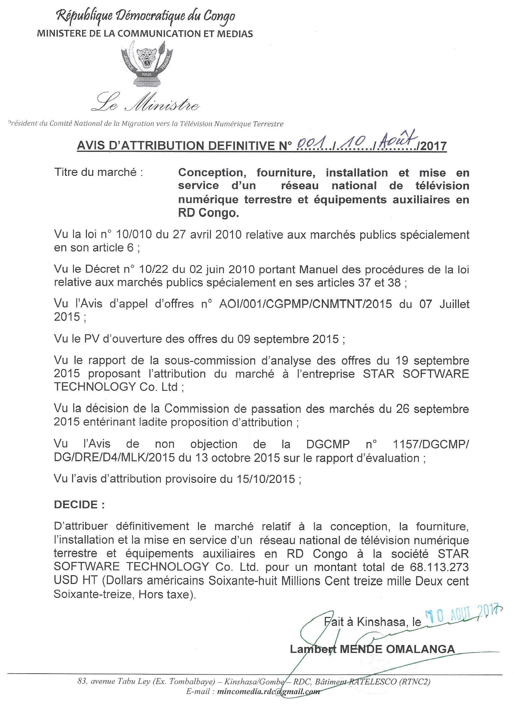Attribution définitive du marché relatif à la conception, la fourniture, l’installation et la mise en service d’un réseau national de télévision numérique terrestre et équipements auxiliaires en RDC à LA SOCIÉTÉ STAR SOFTWARE TECHNOLOGY. LTD