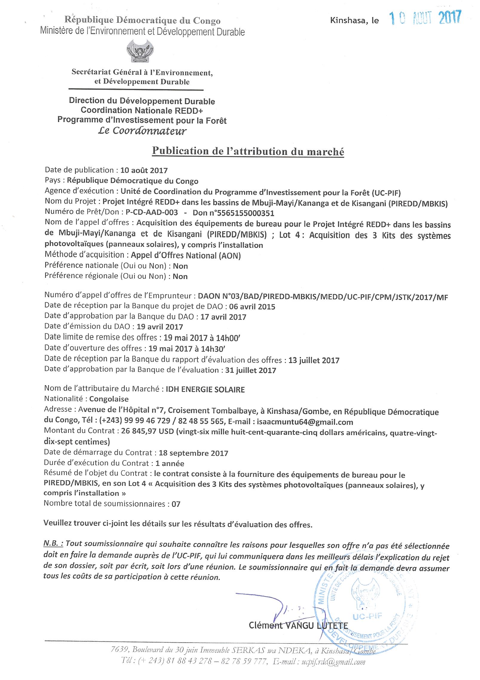 Attribution du marché d’acquisition des équipements de bureau pour le projet intégré redd+ dans les bassins de Mbuji-Mayi / Kananga et de Kisangani ; lot 4 : acquisition des 3 kits des systèmes photovoltaïques (panneaux solaires), y compris l’installation…