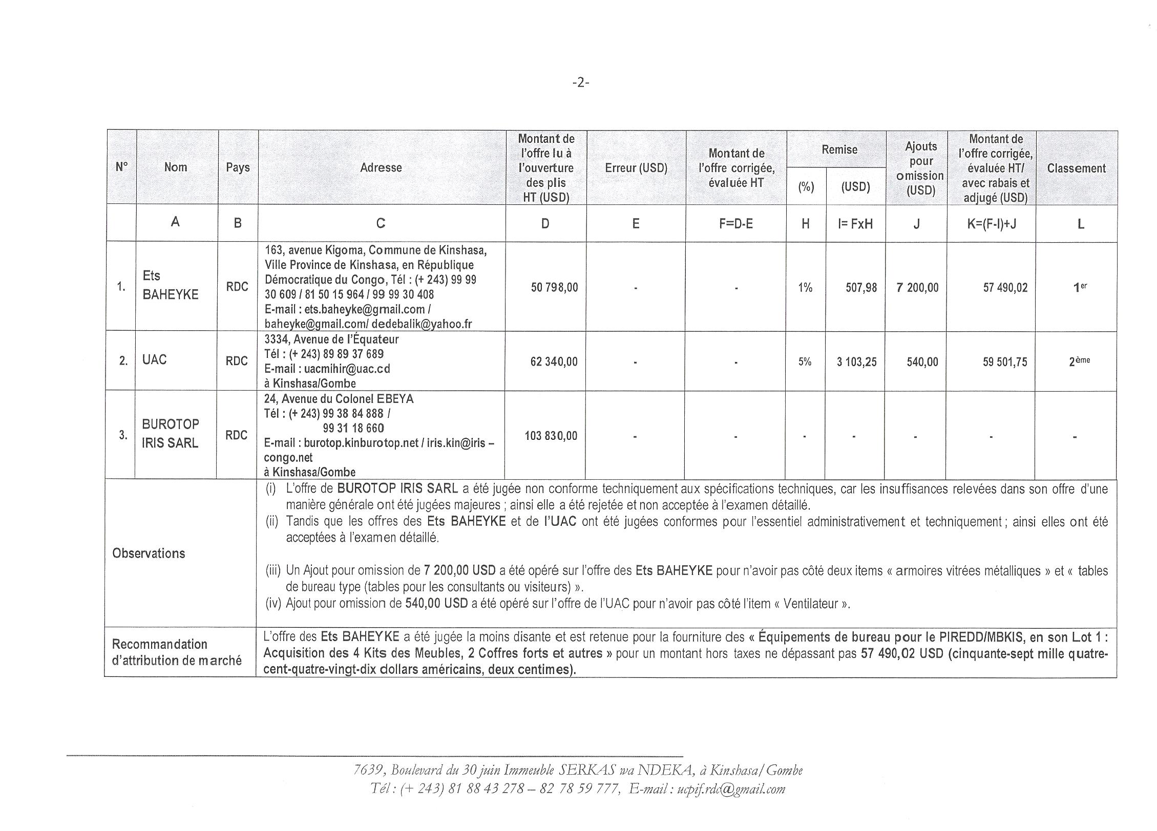 Attribution du marché d’acquisition des équipements de bureau pour le projet intégré redd+ dans les bassins de Mbuji-Mayi / Kananga et de Kisangani ; lot 1 : acquisition des 4 kits des meubles, 2 coffres forts et autres à ETS BAHEYKE.