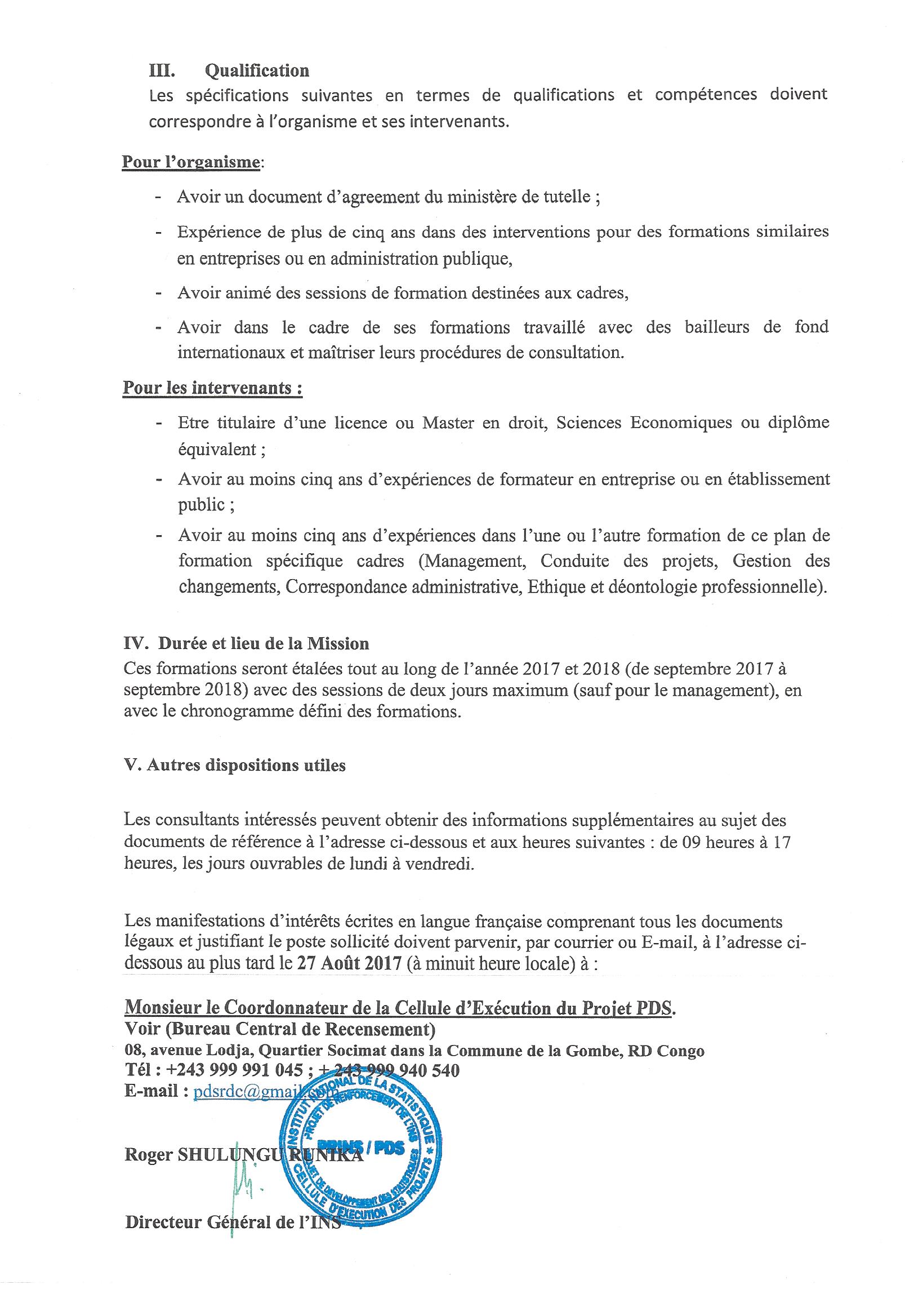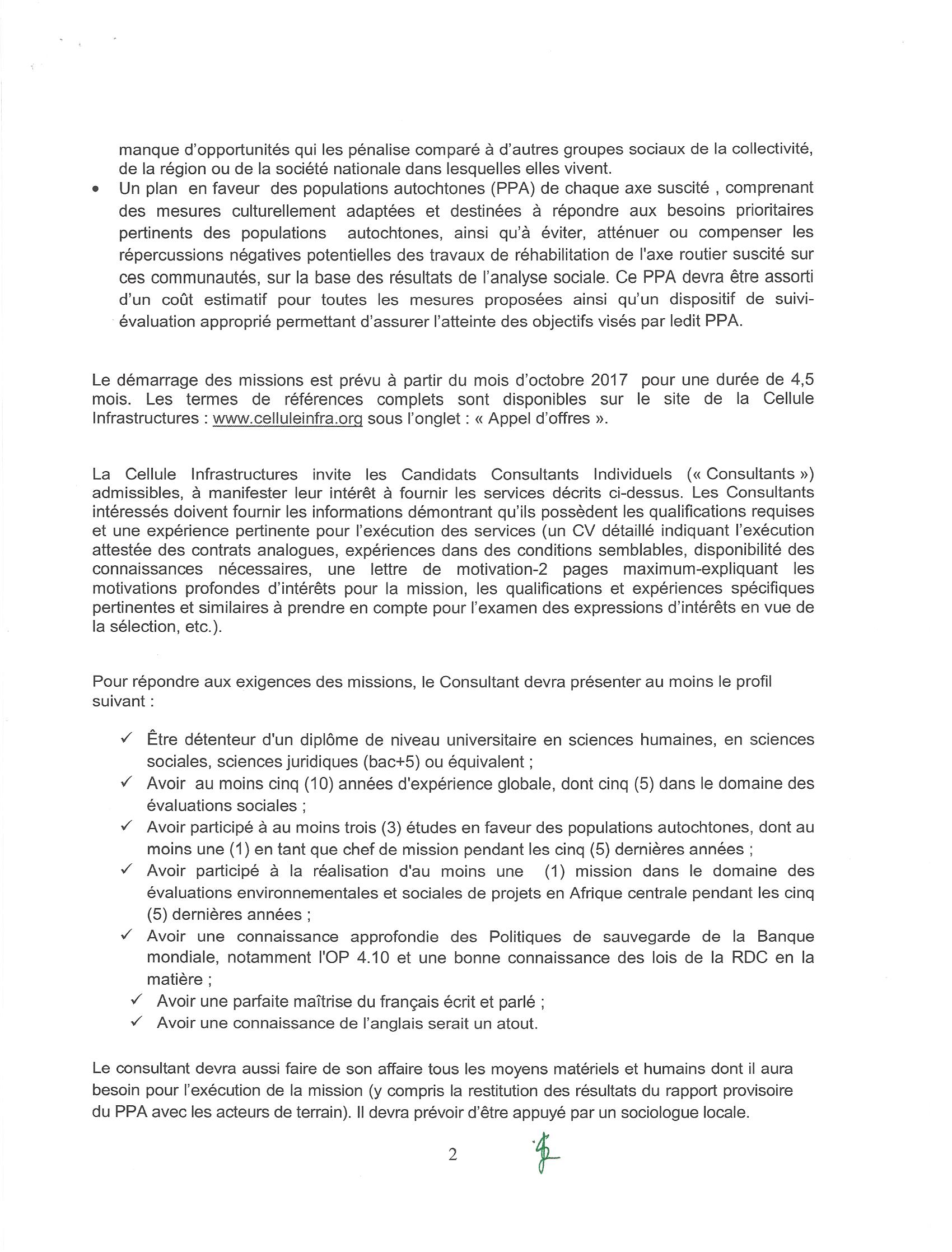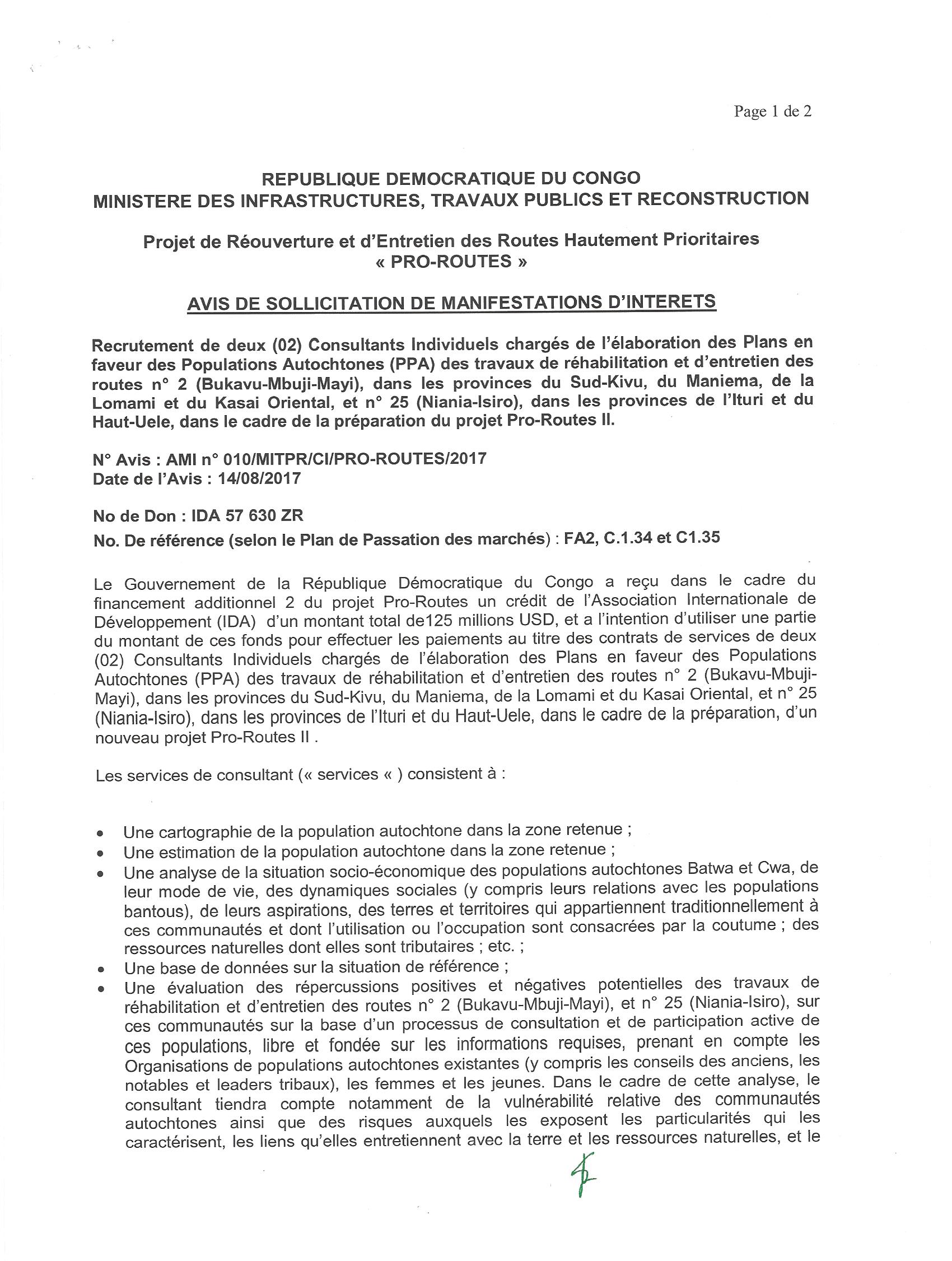 Recrutement de deux Consultants individuels chargés de l’élaboration des Plans en faveur des Populations Autochtones (PPA) des travaux de réhabilitation et d’entretien des routes n°2 (Bukavu-Mbuji-Mayi) dans les provinces du Sud-Kivu, du Maniema, ……..