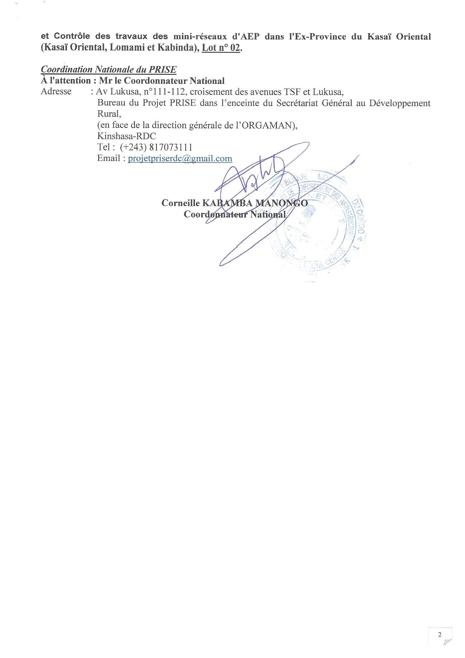 Missions de contrôle des travaux des mini-réseaux d’eau potable en milieu rural dans les Ex-Provinces du Kasaï Occidental pour lot 01 et l’Ex-Province du Kasaï Oriental pour lot 02, en République Démocratique du Congo.
