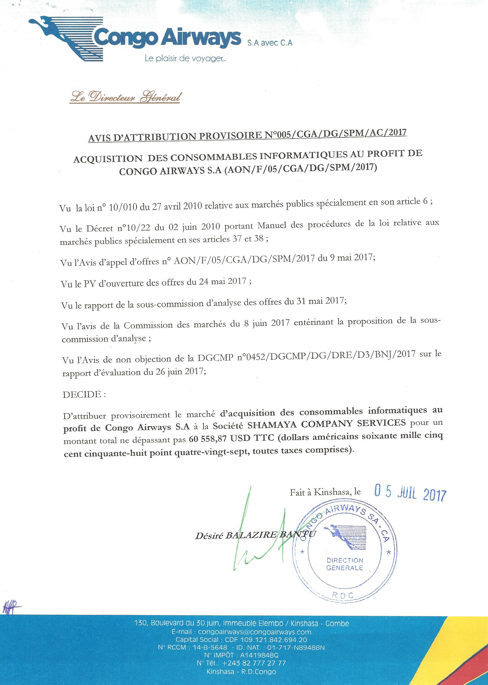 Attribution provisoire du marché d’acquisition des consommables informatiques au profit de Congo Airways à la société SHAMAYA COMPANY SERVICES.