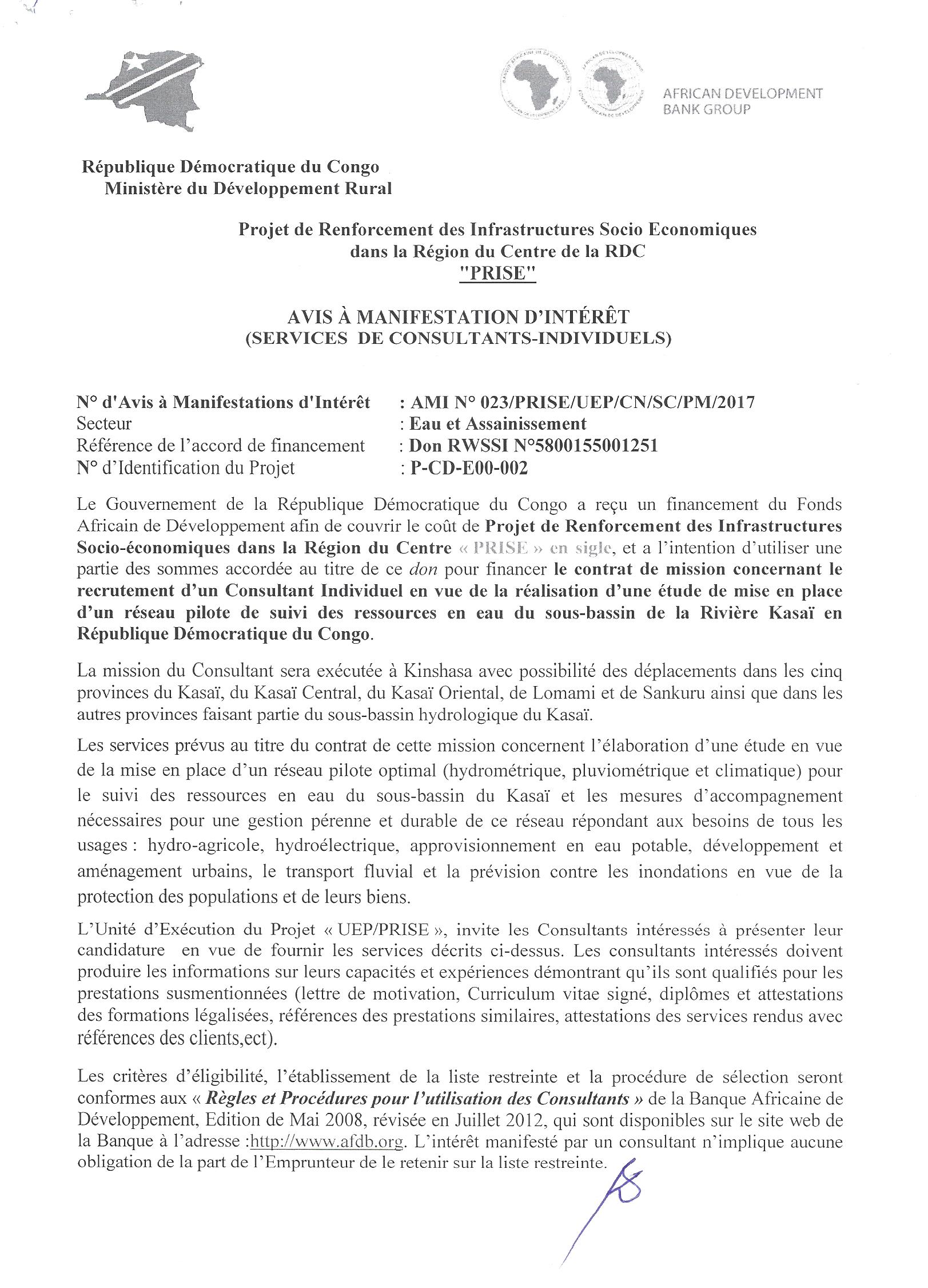 Recrutement d’un Consultant Individuel en vue de la réalisation d’une étude de mise en place d’un réseau pilote de suivi des ressources en eau du sous bassin de la Rivière Kasaï en République Démocratique du Congo.