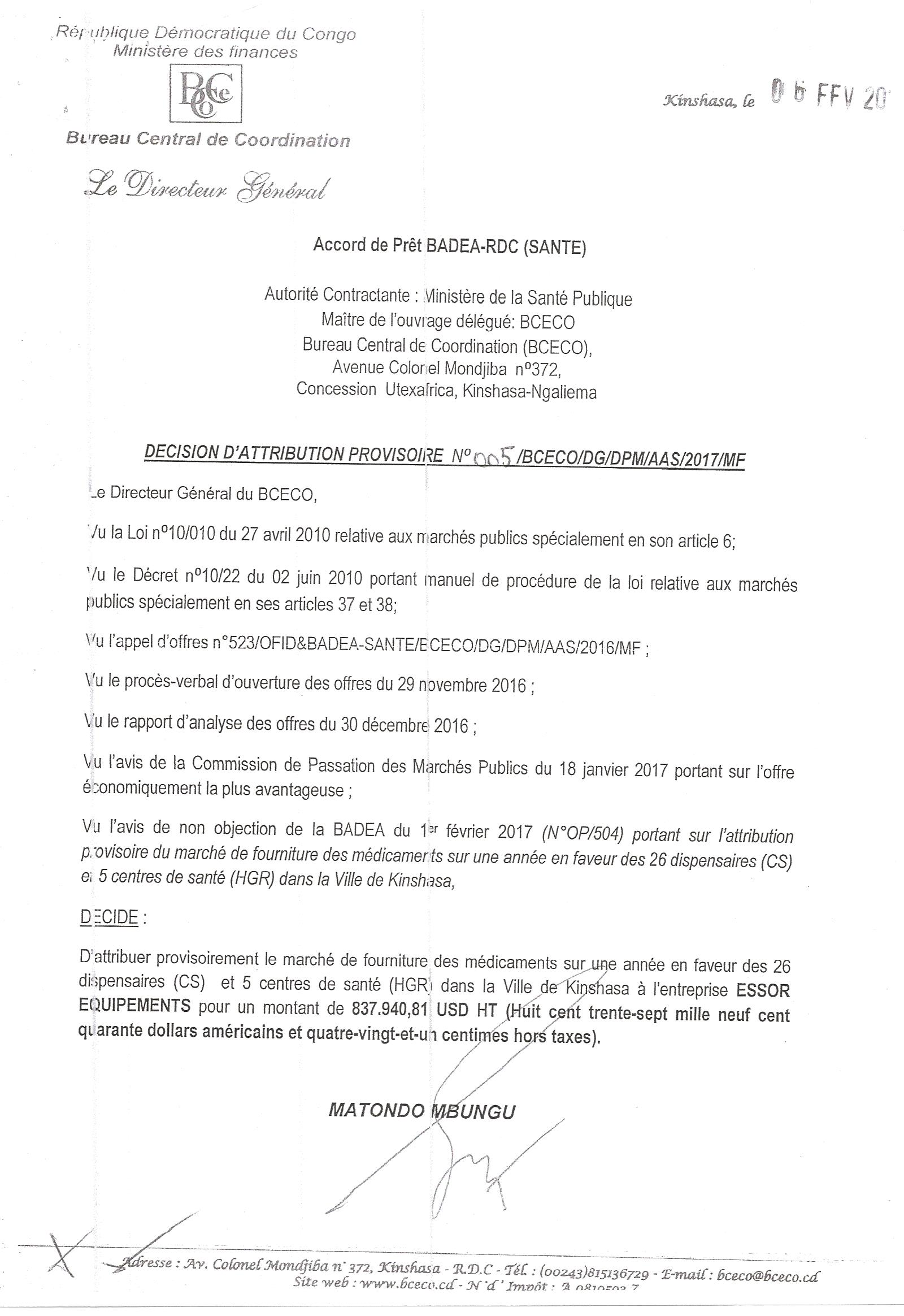 Attribution provisoire du marché de fourniture des médicaments sur une année en faveur des 26 dispensaires et 5 centres de santé dans la ville de Kinshasa à l’entreprise ESSOR EQUIPEMENTS.
