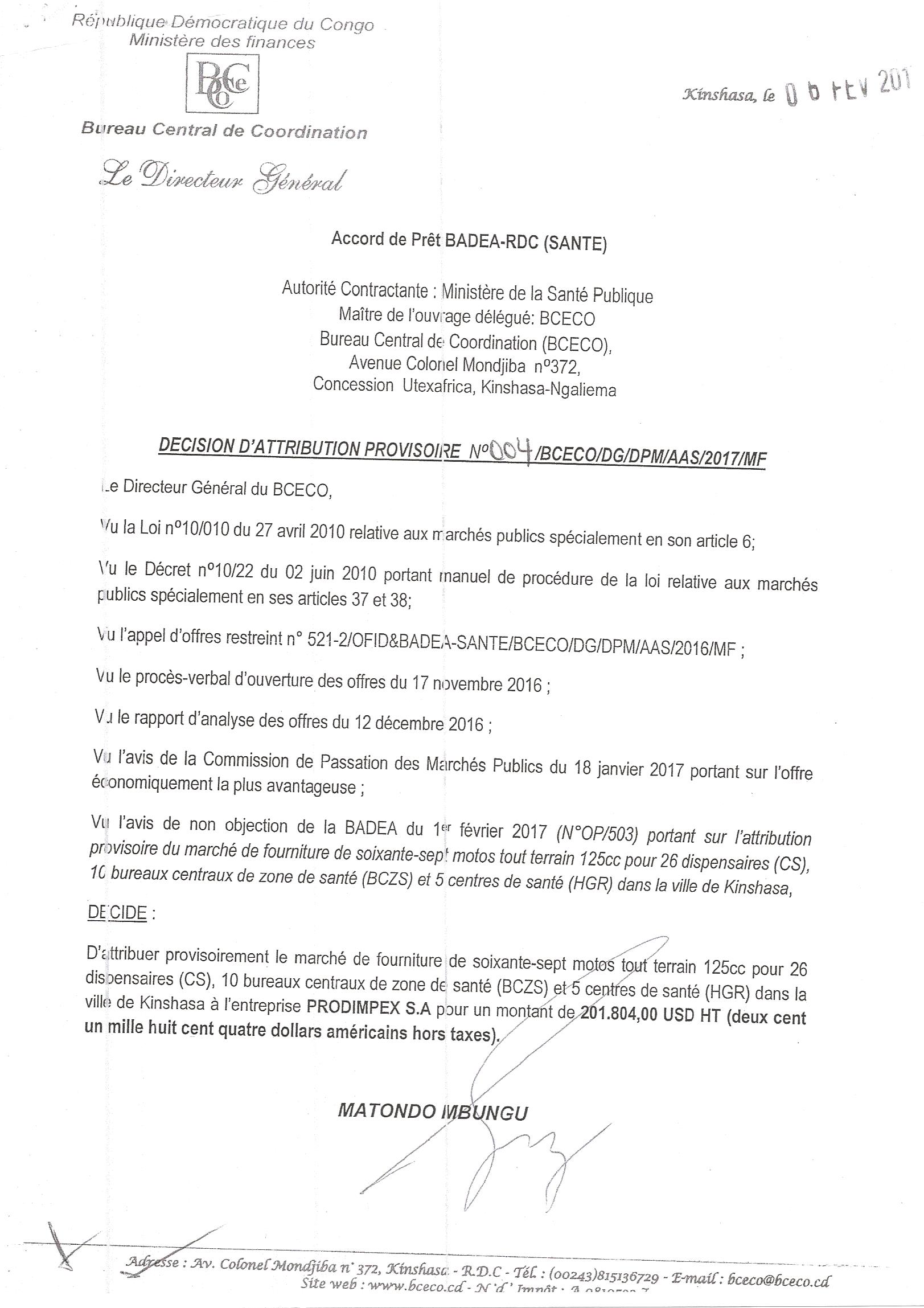 Attribution provisoire du marché de fourniture de soixante-sept motos tout terrain 125cc pour 26 dispensaires, 10 bureau centraux de zone de santé et 5 centres de santé dans la ville de Kinshasa à L’ENTREPRISE PRODIMPEX S.A.