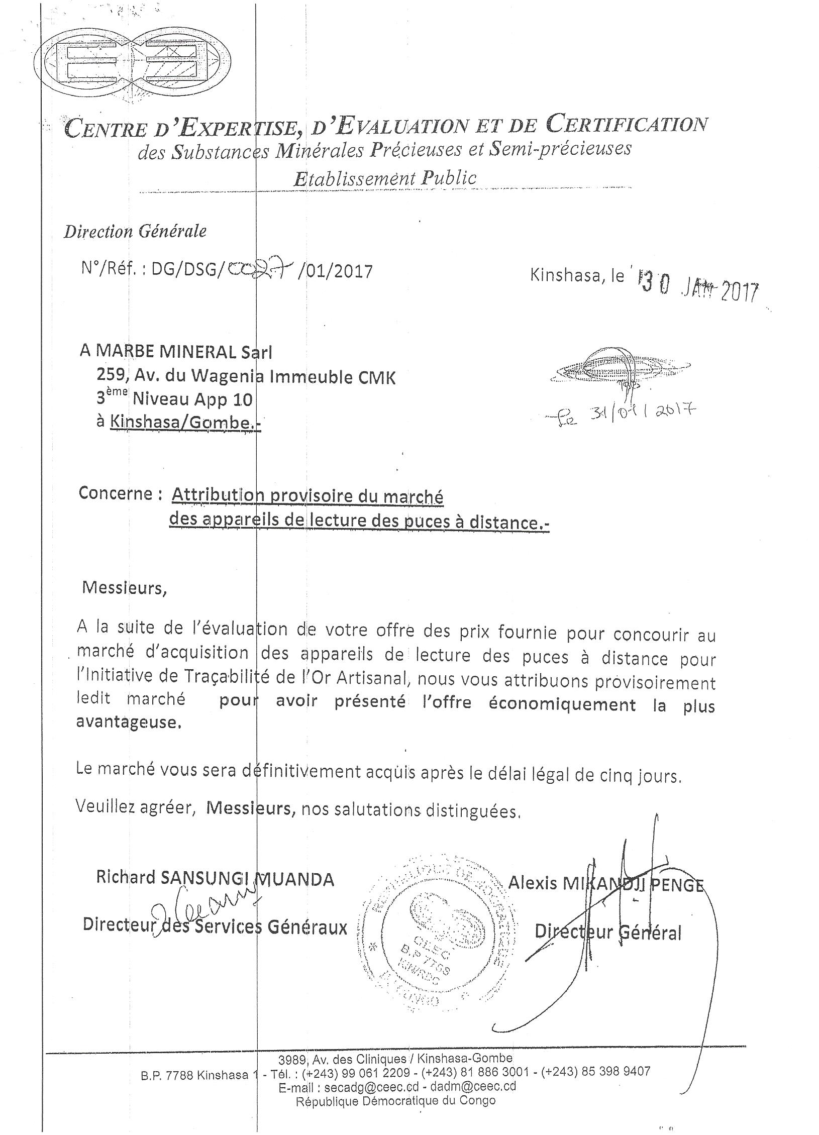 Attribution provisoire du marché des appareils de lecture des puces à distance à marbe minéral SARL.