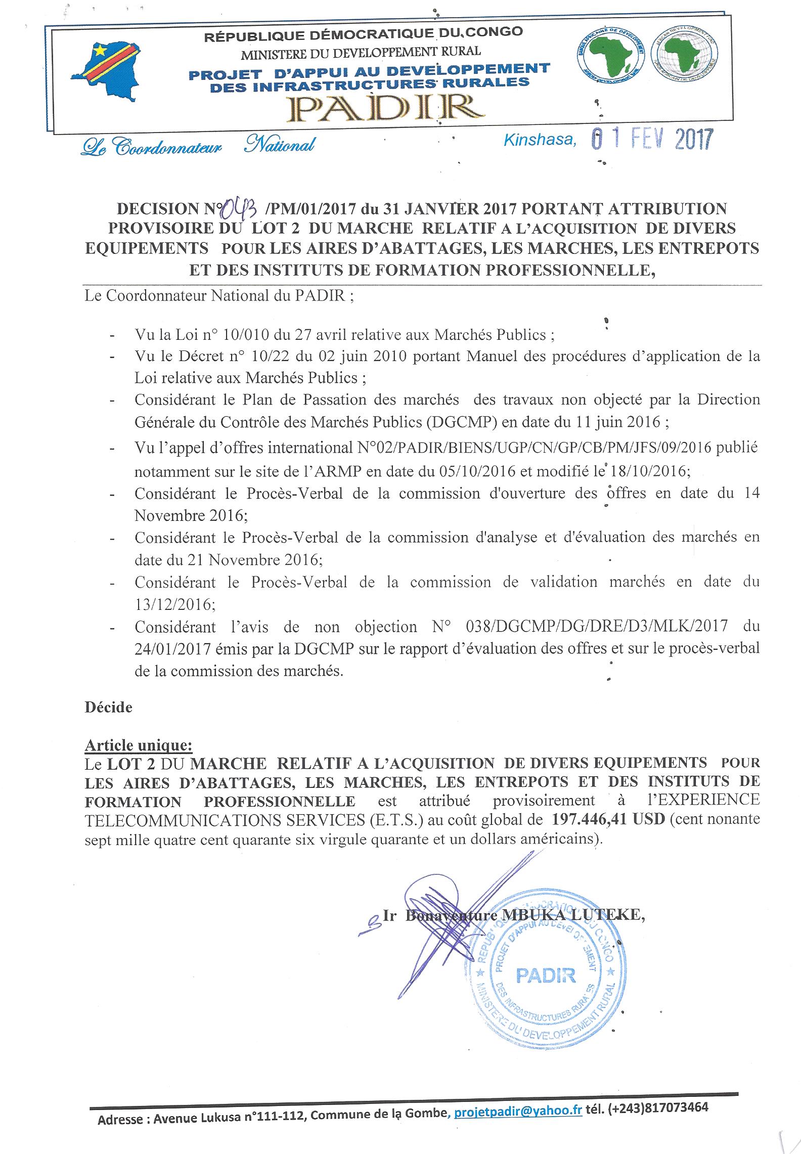 Attribution provisoire du lot 1 du marché relatif à l’acquisition de divers équipements pour les aires d’abattages, les marchés, les entrepôts et des instituts de formation professionnelle à l’expérience télécommunications professionnelle services.